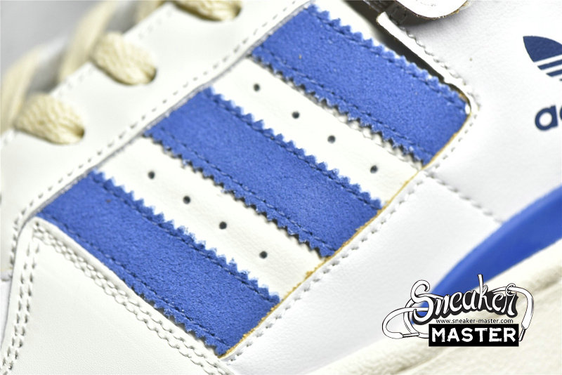 - Released in January 2021, the Forum 84 Low OG 'Bright Blue' features a look that harks back to its 80s roots. The shoe's white upper is built with aged leather, complemented by Bright Blue and secured by an adjustable midfoot strap. Suede marks the Three-Stripes, while underfoot, the off-white midsole includes a visible EVA wedge on the medial side, overlaid by Dillinger webbing. The blue rubber outsole includes a red pivot circle to accent the look.