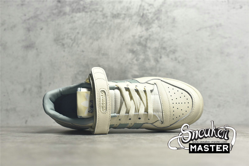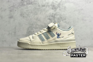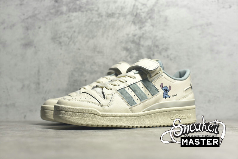 - This offering of the adidas Forum Low features the “Stitch” character on the lateral side and tongues. It features an Off-White leather upper with Hazy Green liners and fuzzy Three Stripes on the sides.