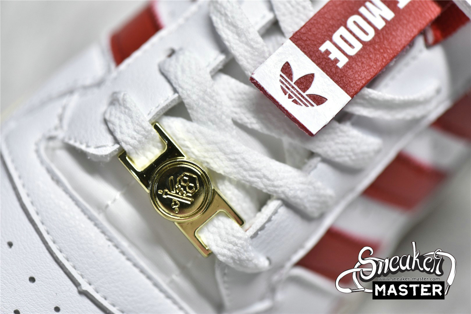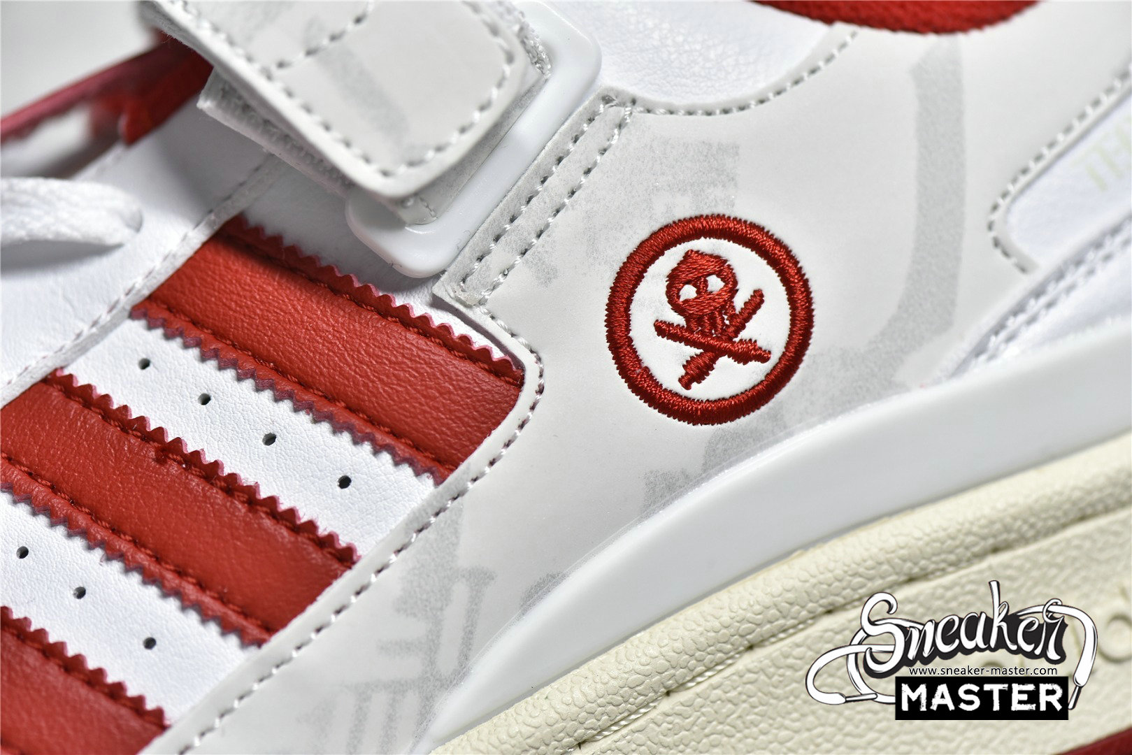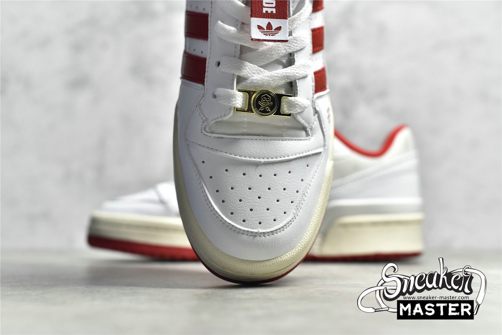 - This offering of the adidas Forum Low features a White leather base with Red appearing on the Three Stripes, lining, and rubber outsole. Other special details includes the head of “TEQ63” embroidered on the lateral side while the same logo is used on the Gold lace dubraes. Finishing off the design are its interchangeable tongue tags and straps with “Manila” and “Forum” text on the velcro tongues. The shoe also comes with additional straps, laces, and hangtags.