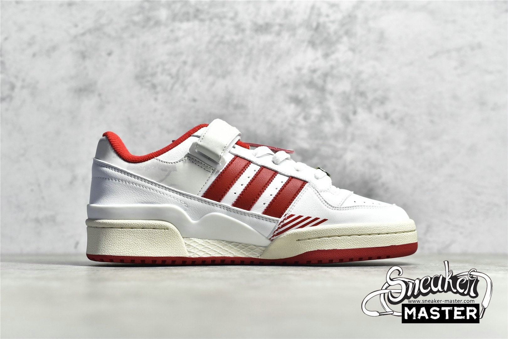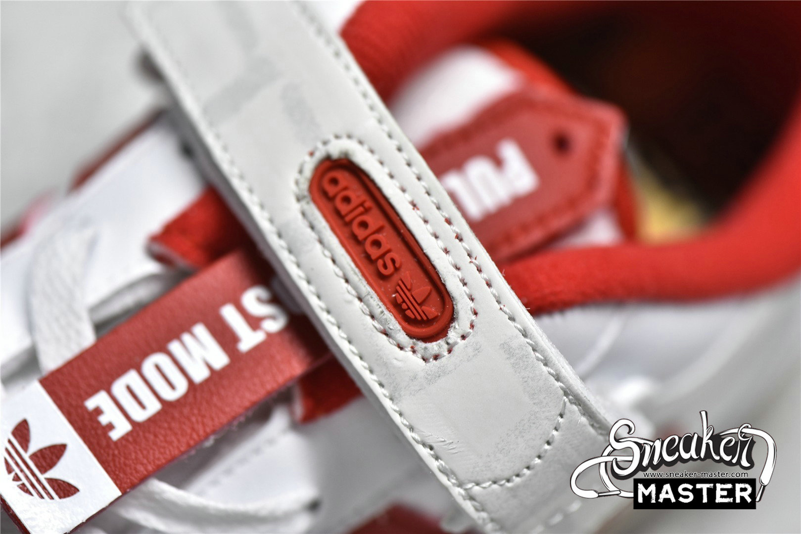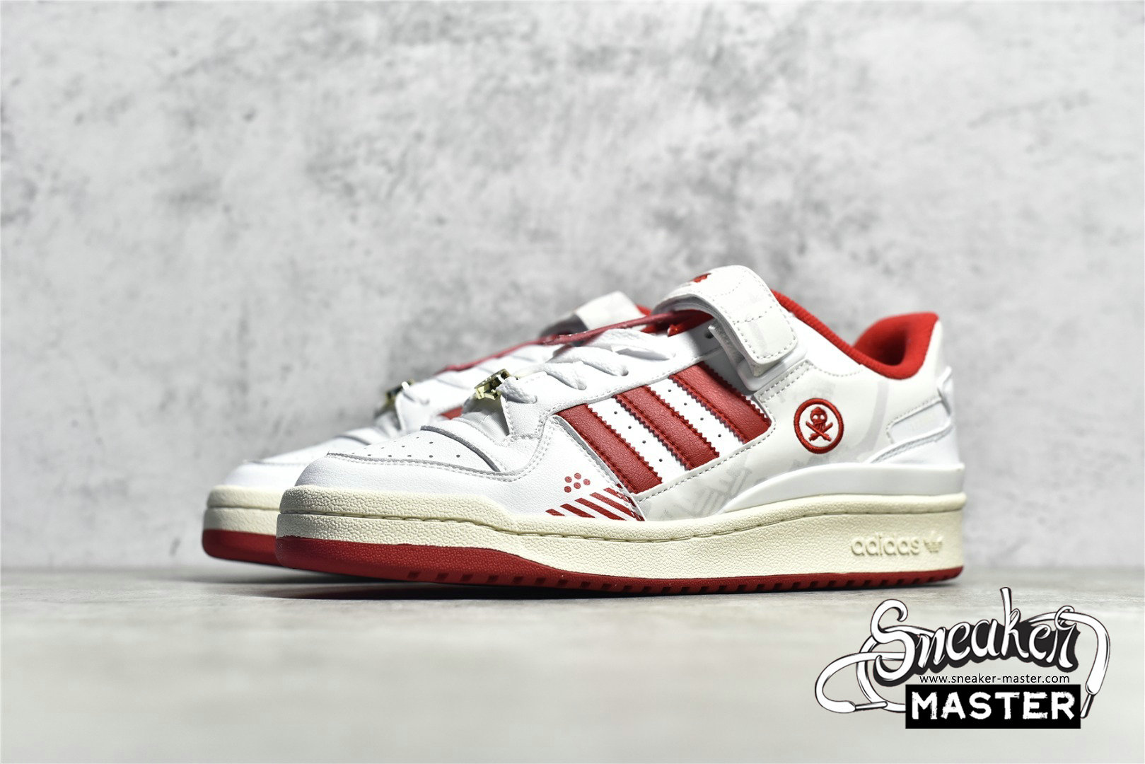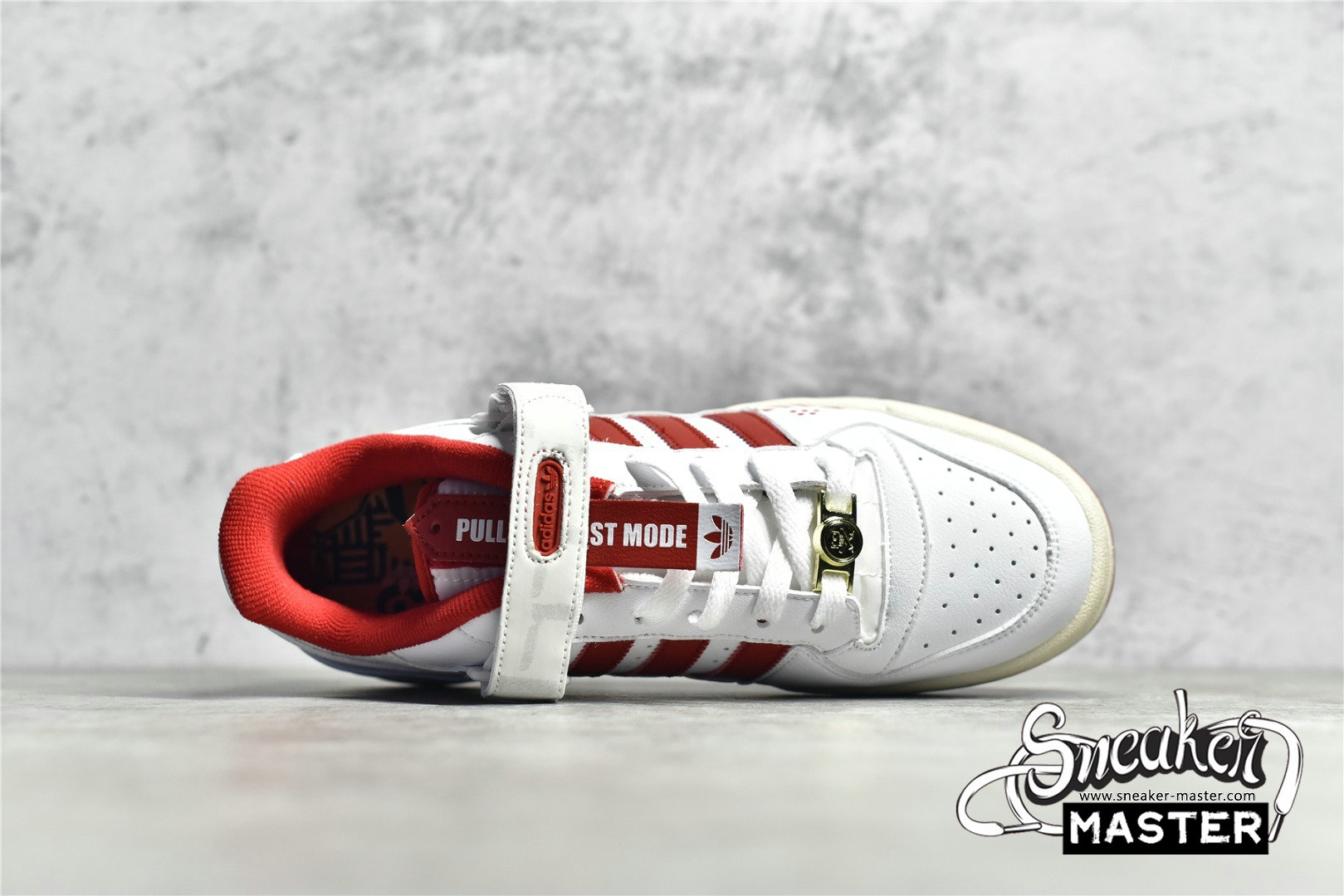 - This offering of the adidas Forum Low features a White leather base with Red appearing on the Three Stripes, lining, and rubber outsole. Other special details includes the head of “TEQ63” embroidered on the lateral side while the same logo is used on the Gold lace dubraes. Finishing off the design are its interchangeable tongue tags and straps with “Manila” and “Forum” text on the velcro tongues. The shoe also comes with additional straps, laces, and hangtags.
