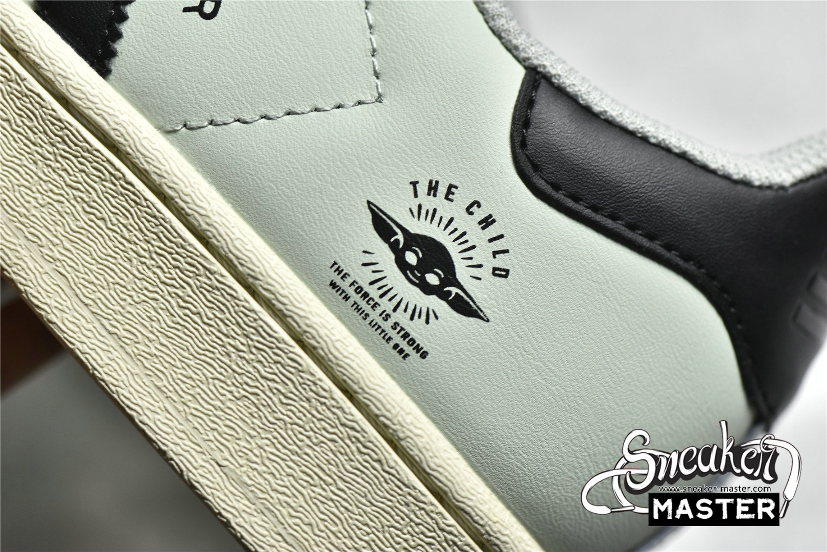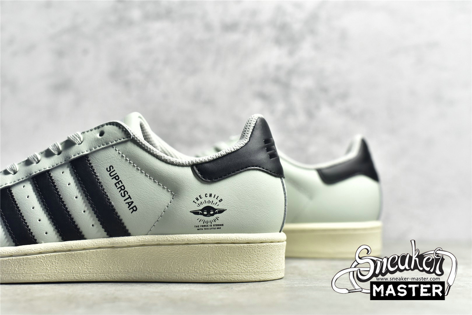 - One of several shoes in The Mandalorian collection, the Star Wars x Superstar 'The Child' pays tribute to The Child—better known as Baby Yoda. The shoe's leather upper appears primarily in Linen Green, with black on the Three-Stripes and heel patch contrasting the look. The heel includes a graphic of Baby Yoda to play to the theme, while the tongue includes a tribute to the 50th anniversary of the silhouette in Star Wars' Aurebesh alphabet.