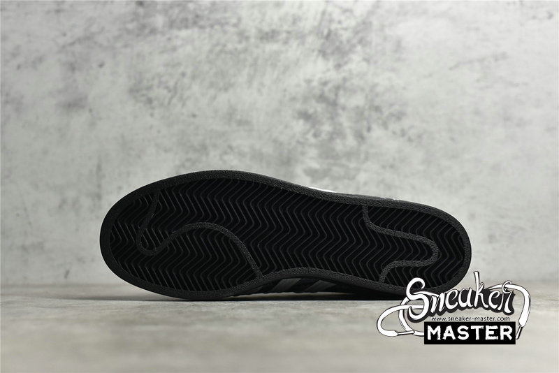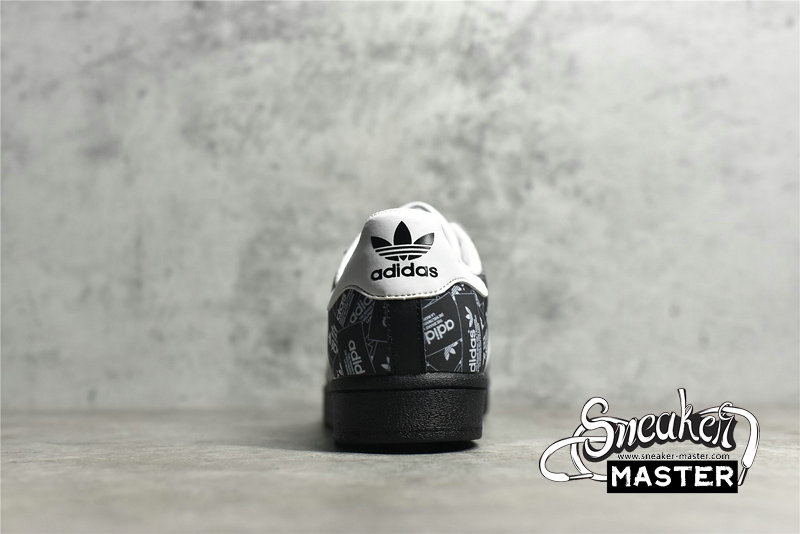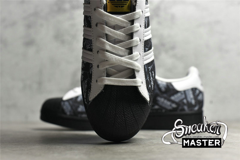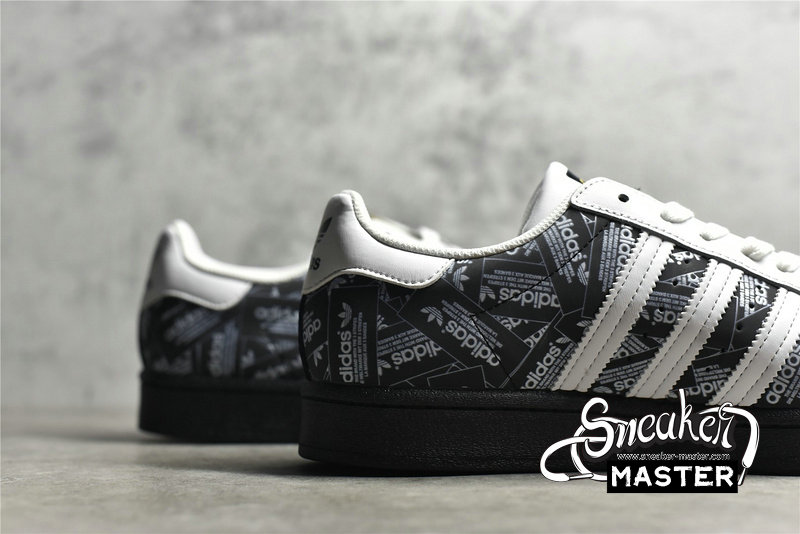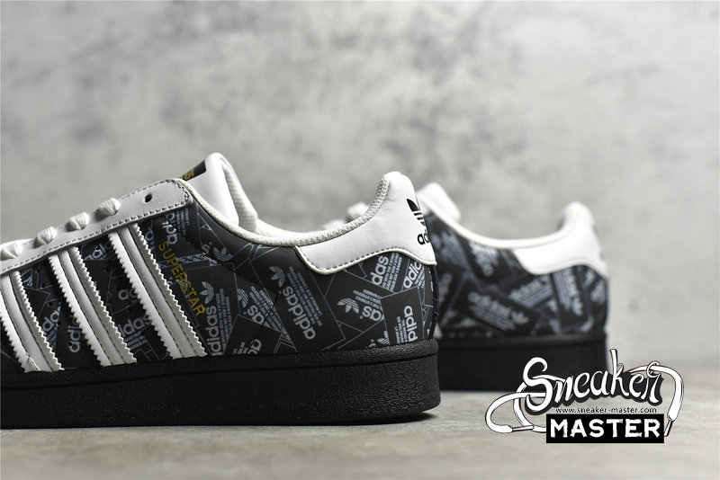 - Celebrating 50 years of the silhouette, the Superstar 'All Over Print - Black' emerges with an overbranded look. As a result, the shoe's leather upper sports printed adidas labels throughout its construction. White leather contrasts the eyestay, heel patch and Three-Stripes, while a classic rubber shelltoe in black leads into a tonal rubber cupsole, which includes a herringbone outsole for traction.