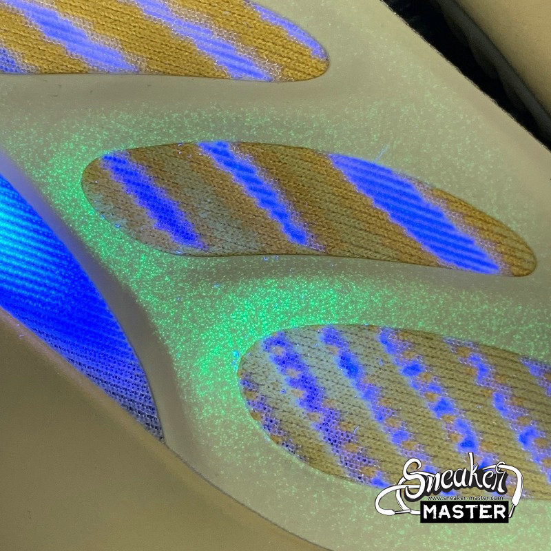 - The Yeezy 700 V3 'Safflower' emerges with a neutral look on its progressive construction. The shoe's monofilament mesh upper includes striated detailing throughout its design, with a glow-in-the-dark RPU cage that runs the length of the shoe. A black inner bootie and tonal laces support the fit, while underfoot, the EVA midsole is encased in PU, with an exaggerated build at the heel. A rubber outsole is included for traction.