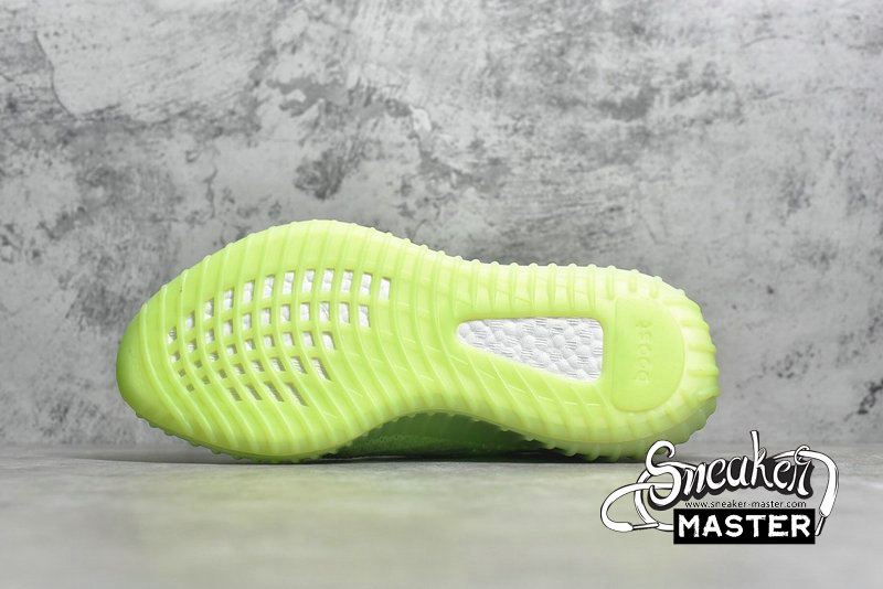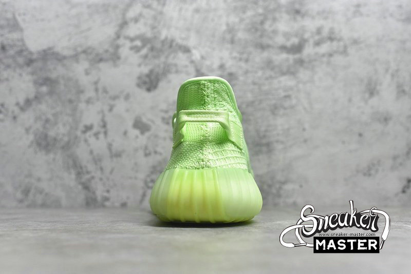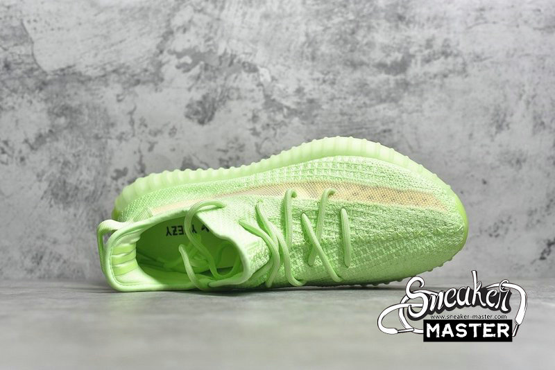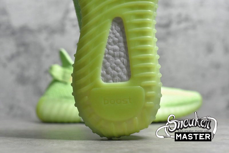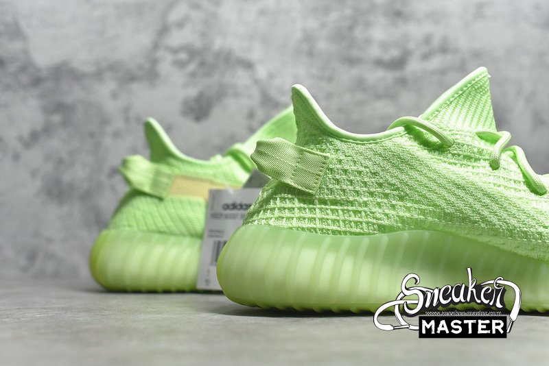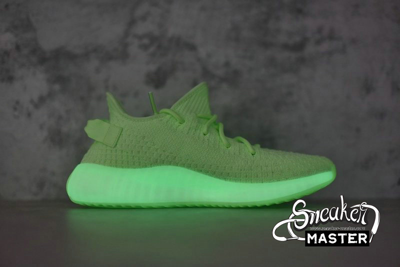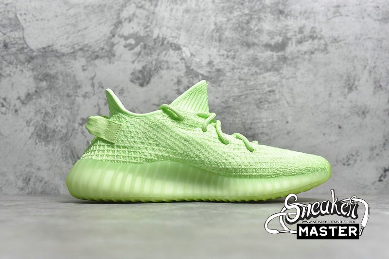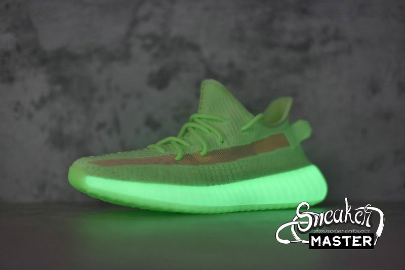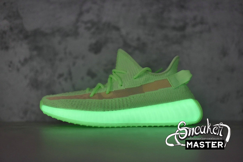 - The Yeezy Boost 350 V2 GID 'Glow' features a glow-in-the-dark finish throughout its Primeknit upper. The signature design includes a translucent monofilament stripe for the only contrast, as the rope laces and heel pull-loop are worked tonally into the construction. Underfoot, a Boost midsole is encased in a Tubular sole unit to support the fit.