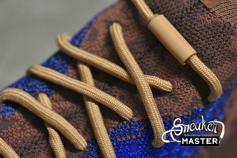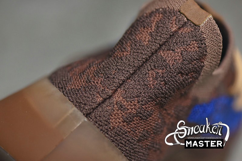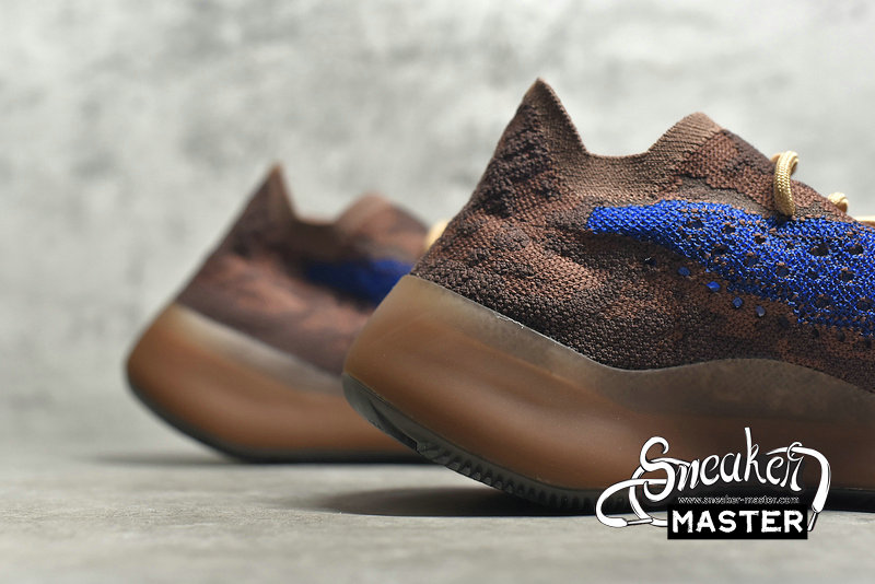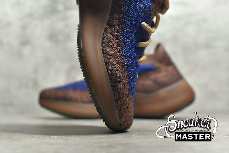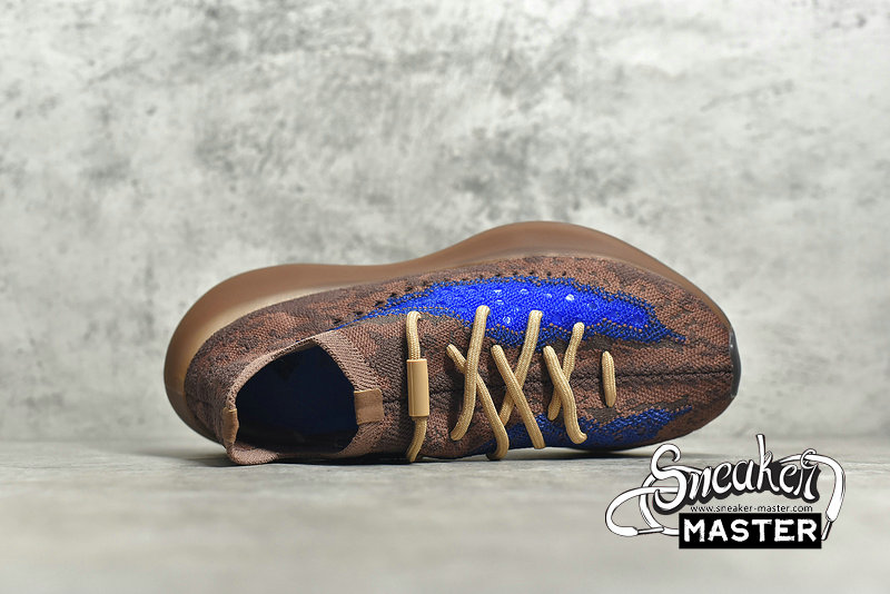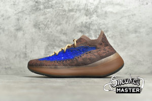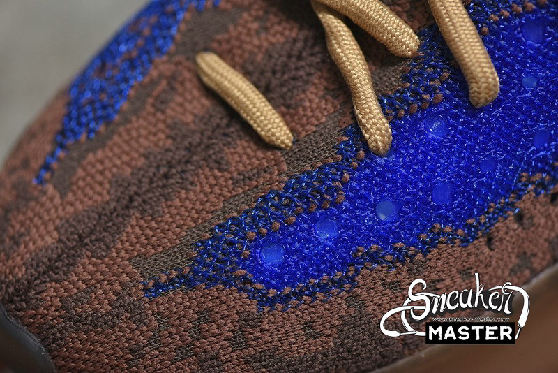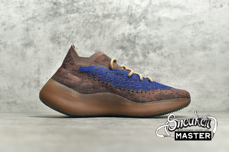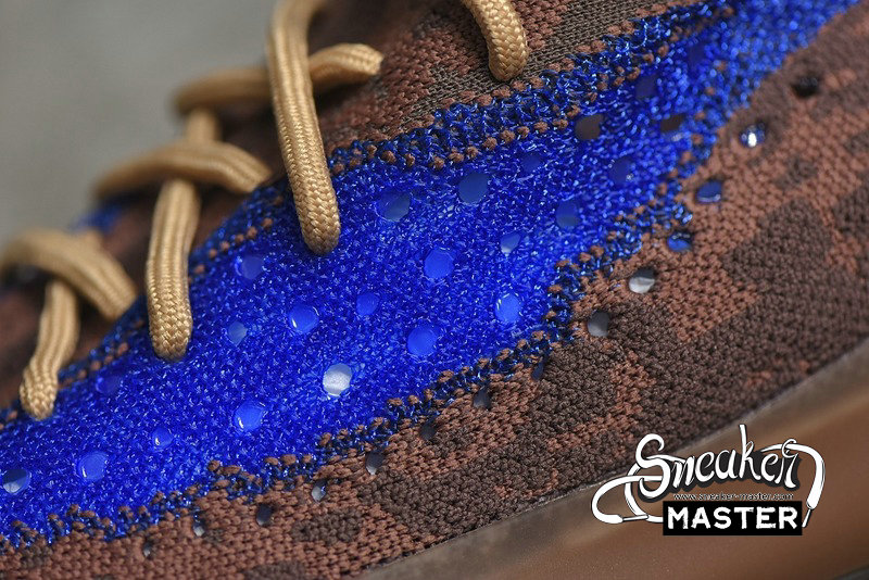 - The Yeezy Boost 380 'Azure' emerges with a neutral look and a vibrant accent. Built with Primeknit, the upper appears in brown, highlighted by blue on the signature monofilament window. The sock-like upper is supported underfoot by a full-length Boost midsole with an elevated heel, while the outsole incorporates a herringbone pattern for traction.
