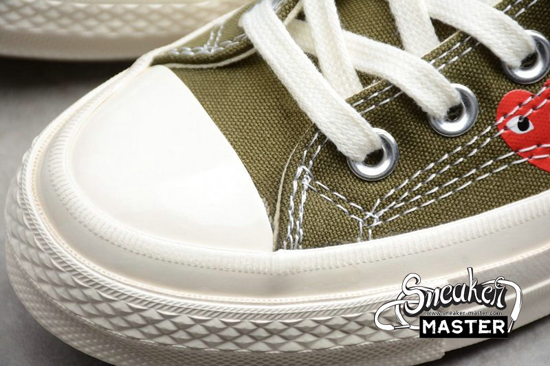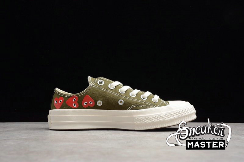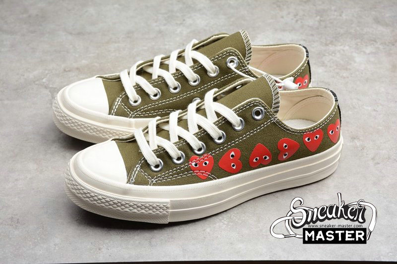 - A collaboration between Converse and Japanese label Comme des Garçons, this Play x Chuck 70 Low Top ‘Multi Heart’ was released in April 2018 and features a Khaki Green canvas upper, white stitching, and the brand’s red heart-shaped faces along the medial and lateral sides. A black stripe is seen at the heel, and the midsole and outsole are rubber.