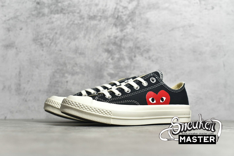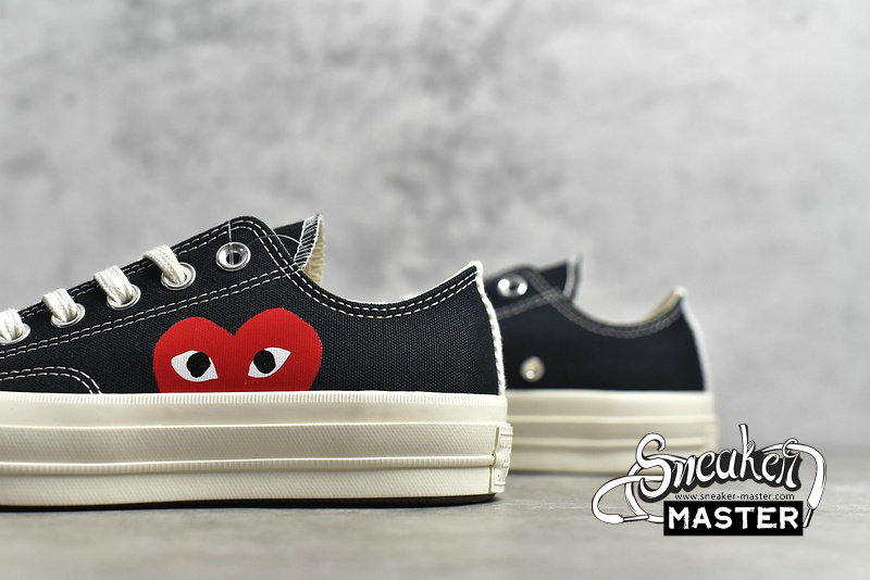 - Designed by graphic artist Filip Pagowski and Comme des Garçons founder Rei Kawakubohe, the Comme des Garçons x Chuck Taylor 1970 Low 'Play' is a special edition colorway that features a black canvas upper with an oversized signature CDG red heart printed at the quarter panels.