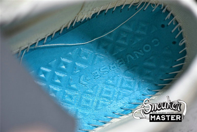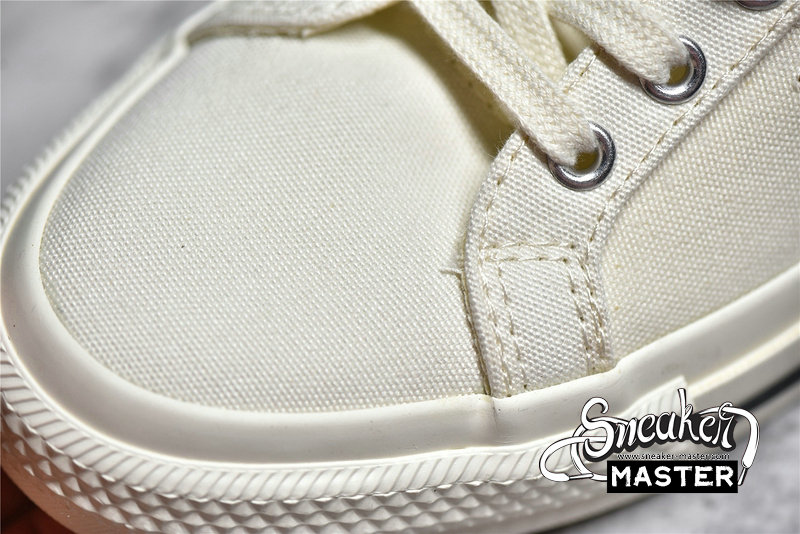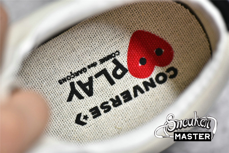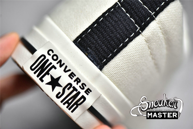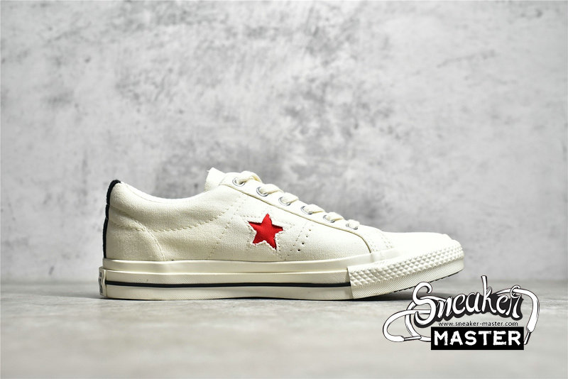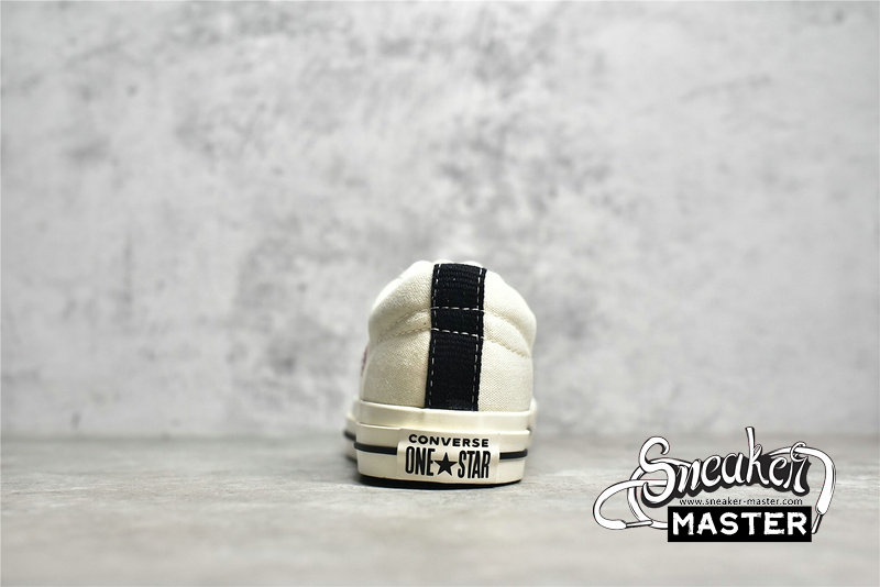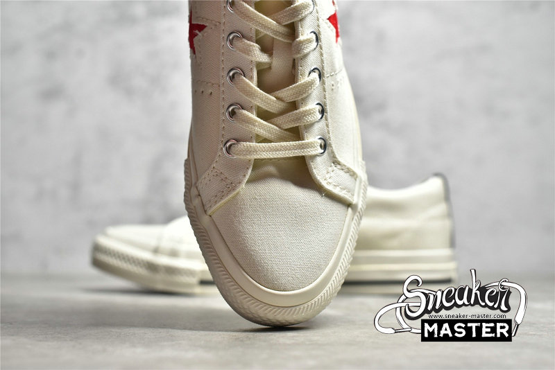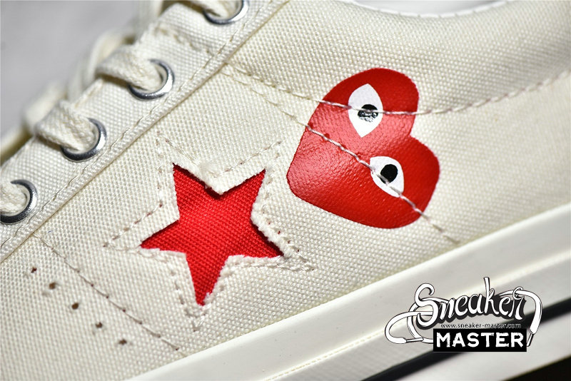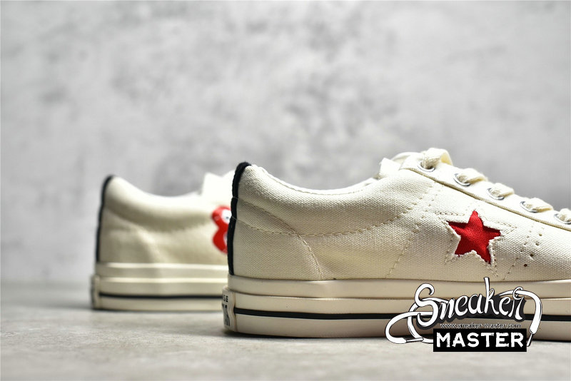 - The low-top CDG x Converse One Star ‘Cloud Dancer’ features a white cotton canvas upper with white stitching, laces, and midsole. The CDG Heart has been printed sideways onto the side of the sneaker in red, while the Converse Star has been cut out of the panel to show the red canvas below and is highlighted in white stitching. The black heel tab adds a bit of contrast to the otherwise white colorway.