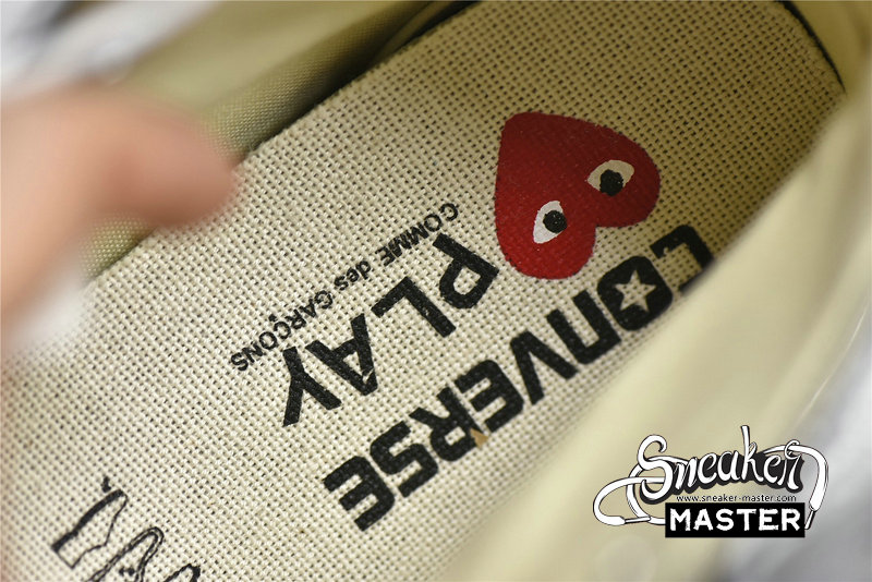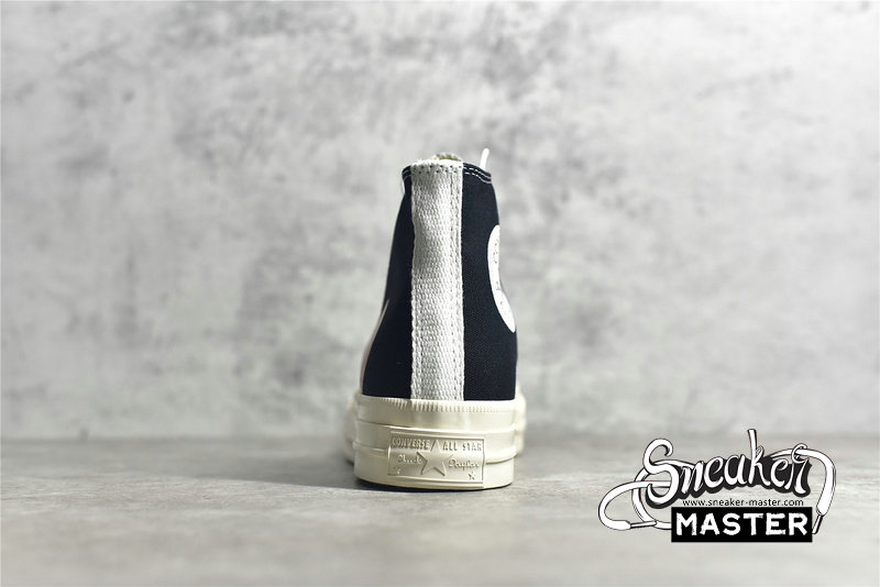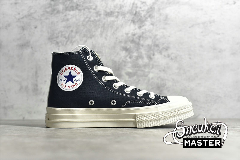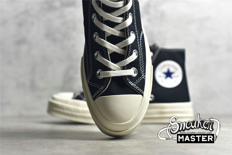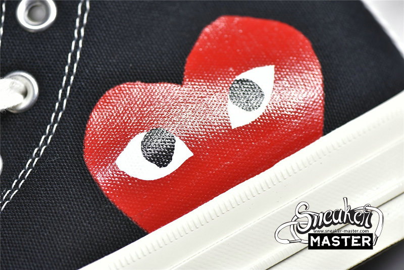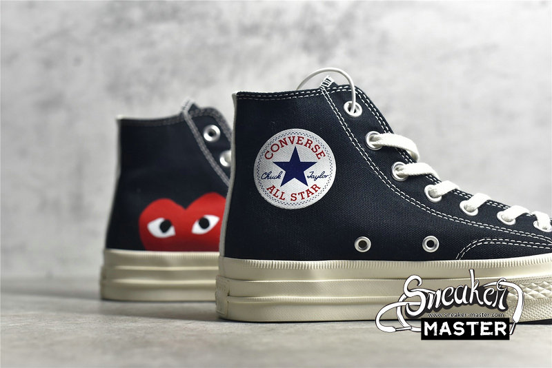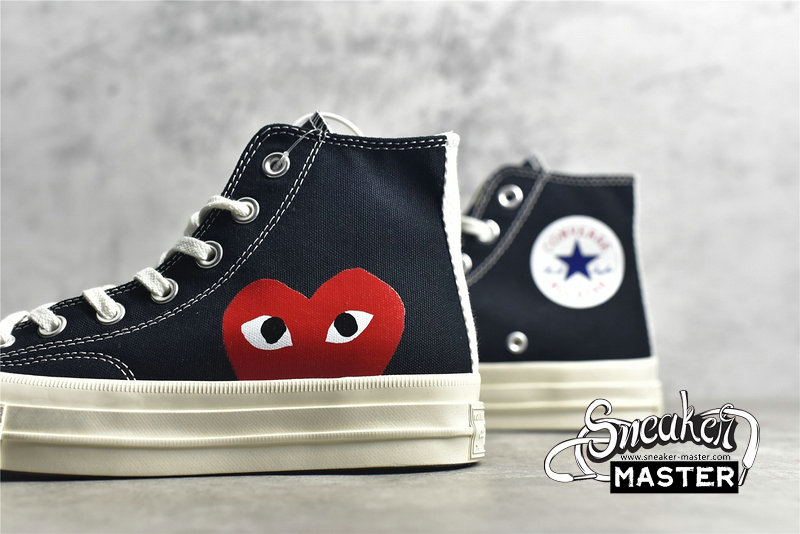 - A collaboration between Commes des Garçons and Chuck Taylor, the Comme des Garçons x Chuck Taylor All Star High 'Play' features a black canvas upper accented by a red peekaboo heart designed by Filip Pagowski on the lateral quarter panel. The usual Converse branding appears on the medial side, while an off-white toe cap gives way to a vuclanized rubber midsole. The shoe released alongside a white colorway.