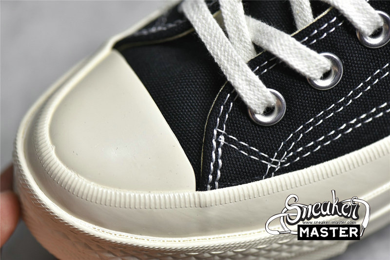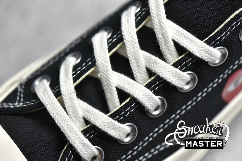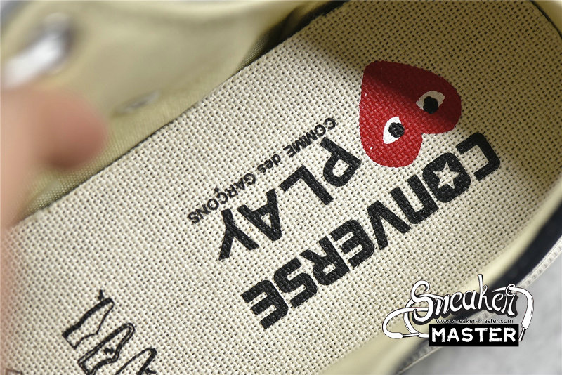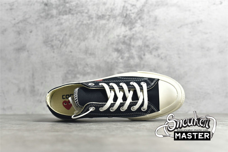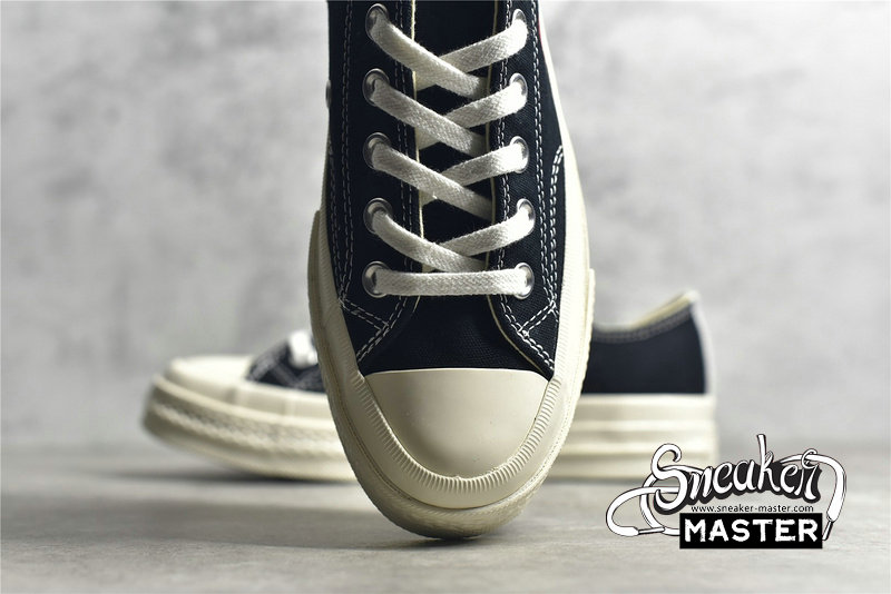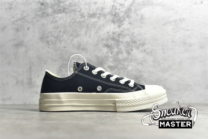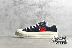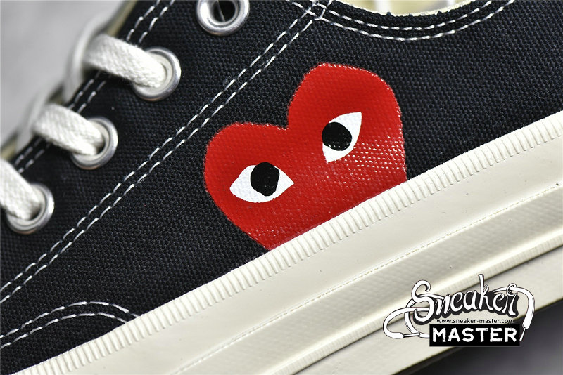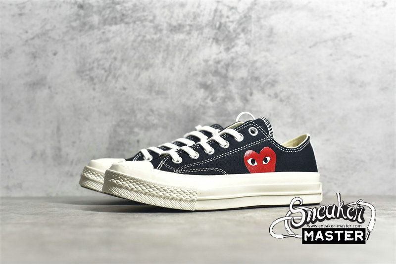 - Designed by graphic artist Filip Pagowski and Comme des Garçons founder Rei Kawakubohe, the Comme des Garçons x Chuck Taylor 1970 Low 'Play' is a special edition colorway that features a black canvas upper with an oversized signature CDG red heart printed at the quarter panels.