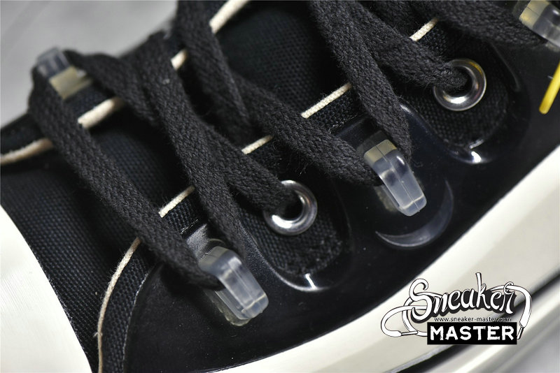 - Made in collaboration with the British fashion designer, the Kim Jones x Chuck 70 High 'Black' brings a bold look to the classic silhouette. The shoe's upper is built with 12oz canvas, finished in black and bolstered by a transparent TPU cage. That cage works speed hooks into the lacing system to secure the fit, while raised, wavy foxing in contrasting white supports the build. The tongue includes Kim Jones branding, and underfoot, an updated diamond-grid on the rubber outsole offers traction.