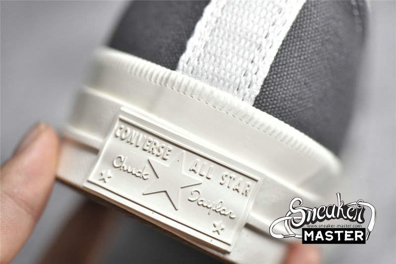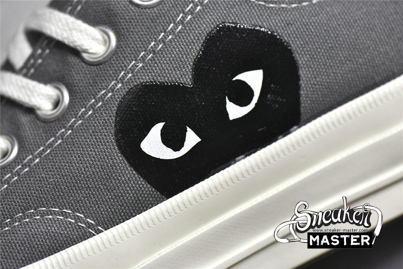 - Made with the help of the Japanese brand, the Comme des Garçons PLAY x Chuck 70 Low 'Steel Gray' brings a monochrome look to their signature heart and eyes logo. The design appears on the lateral side of the upper, which is built with canvas and finished in grey. Contrast stitching emerges throughout, while underfoot, the OrthoLite insole includes co-branding. An off-white rubber midsole anchors the build, with a rubber outsole for traction.