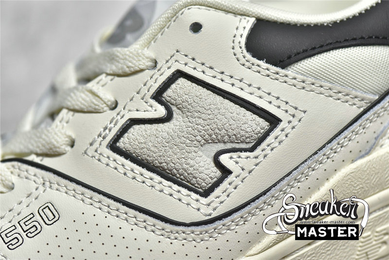 - The sneaker features a cream leather upper with black accents throughout. The N logo on the quarter panels are outlined in black, as well as the 550 branding near the lateral toebox, and the NB logo on the heel. The tongue tag features New Balance branding in a subtle grey with cream featured on the midsole and black and grey on the outsole.