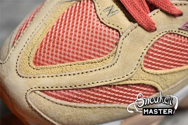 - The pink color scheme consists of different shades. Different materials are also used on the upper. For example, the base of mesh is made in the 'Penny Cookie Pink' color. The rest of the upper is made of suede in a beige color. The 'N' on the side is the same pink as the mesh, and as the laces. The 90/60 branding and the logo on the tongue have been given a turquoise color, which immediately stands out among the pink tones. There is a silver-coloured edge around the heel, which gives it even more spice. The midsole is divided into two parts, the rear part of which is also turquoise.