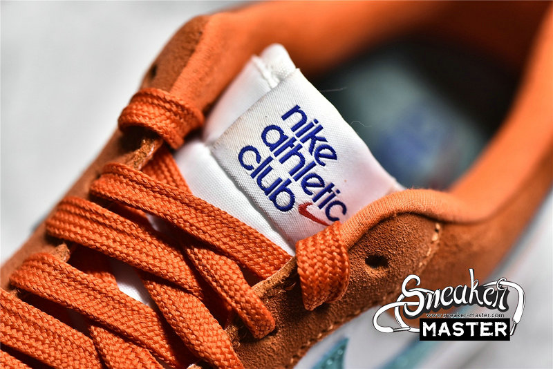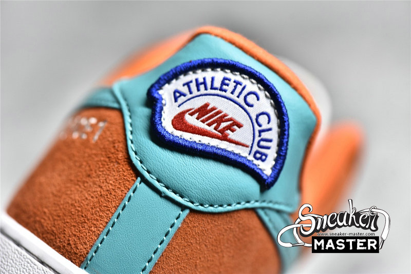 - This Nike Air Force 1 comes with White leather across the base while Orange suede adorns the overlays. Adding more pop, Teal leather adorns the Swoosh logos and heel. Located on the tongue, we have a retro Nike Athletic Club label with the logo being spotted on the insoles. Lastly, we have a patch on the heel to finish the look.