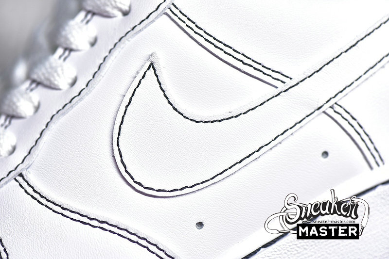 - This Nike Air Force 1 feature a clean White leather upper paired with Black contrasting stitching throughout. Black also appears on the tongue label, lining, heel branding and rubber outsole atop a White midsole.