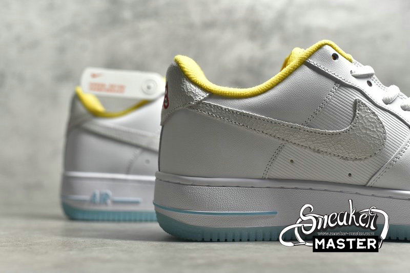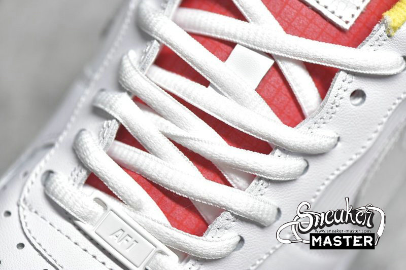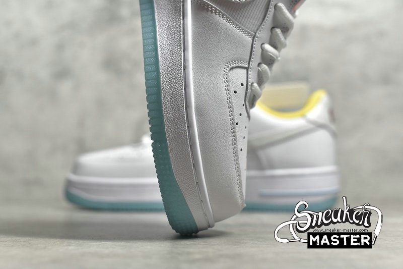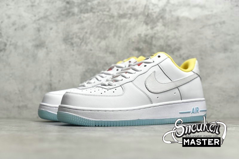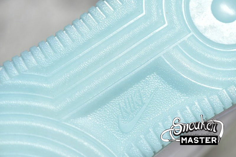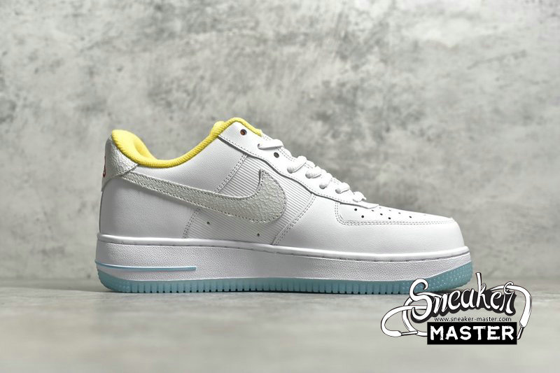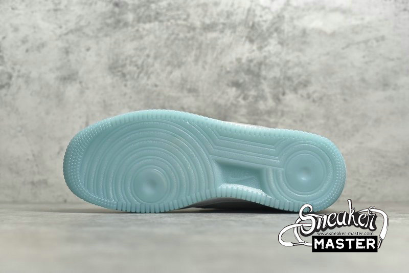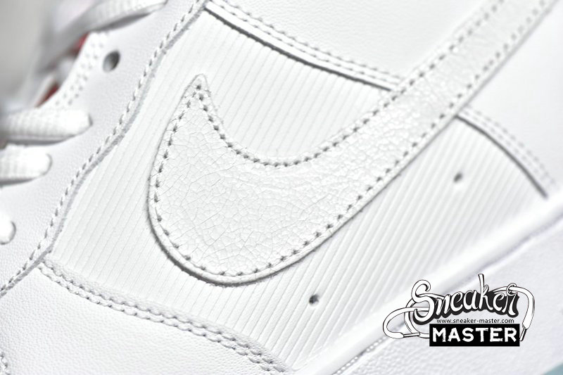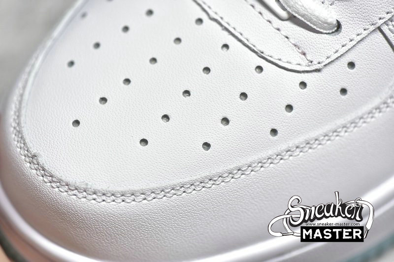- Predominantly clad in its signature “White”, this Air Force 1 Low is anything but traditional. Midfoot panels feature horizontal cutouts, while adjacent Swooshes are constructed with material ostensibly hand-painted and pre-cracked. Underfoot, oft-imitated sole units contrast the upper’s palette in a light blue, which is applied in translucent fashion throughout the outsole.