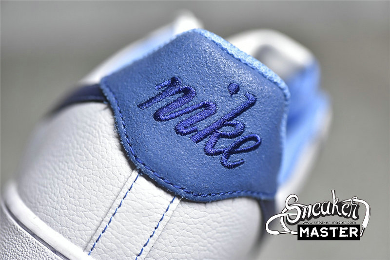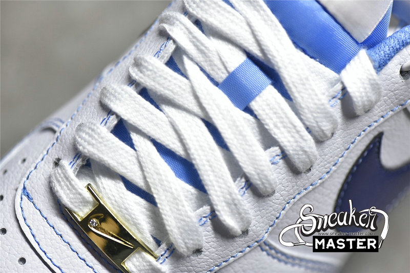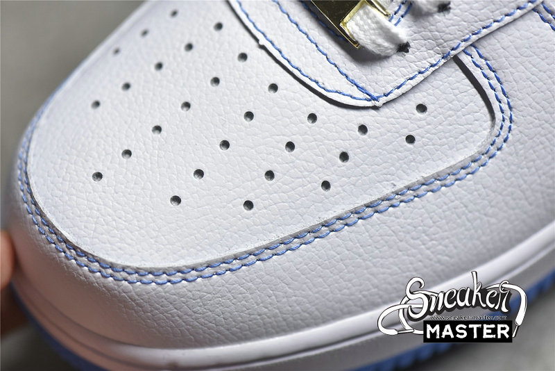 - This offering of the Nike Air Force 1 Low features a White leather base with Dark Blue Swooshes and Light Blue suede heel overlays. Blue contrasting stitching covers the entire shoe while having University Blue nylon tongues and rubber soles completed with Metallic Gold lace dubraes and branded insoles.