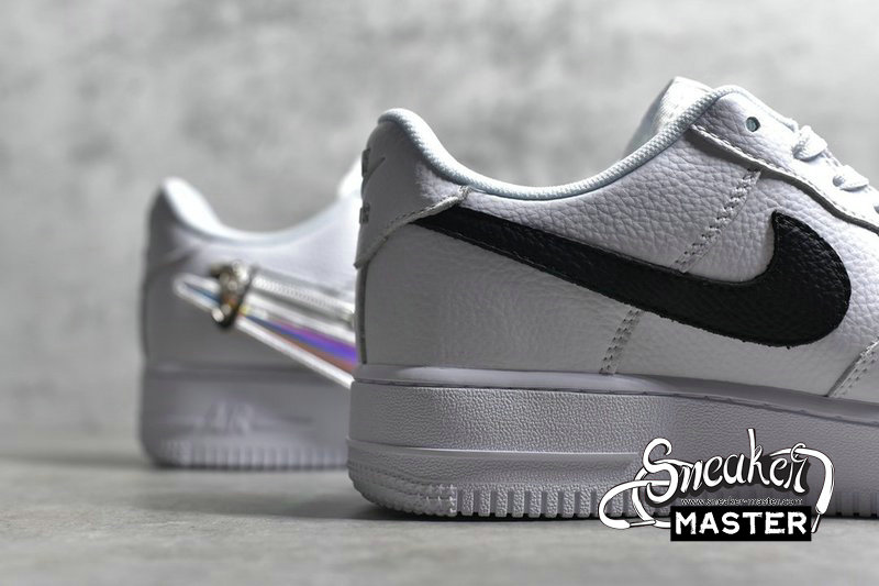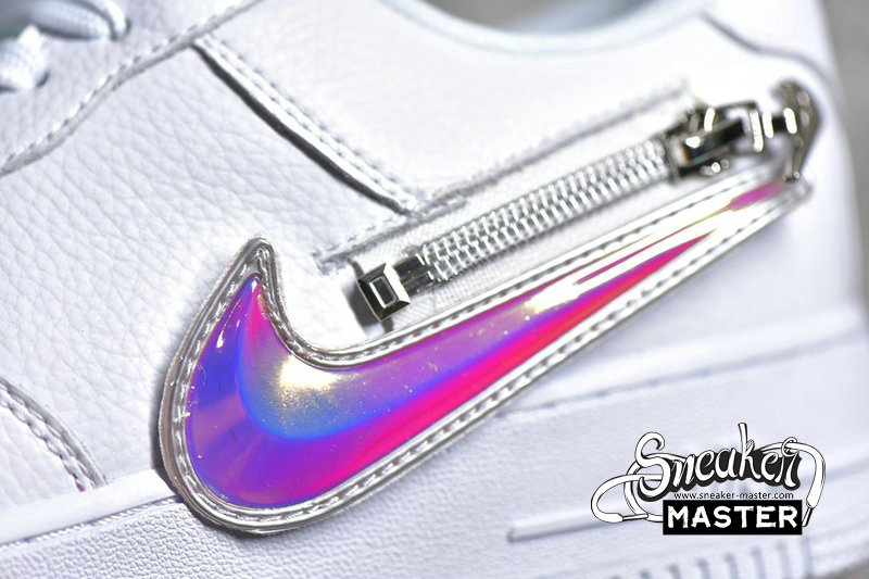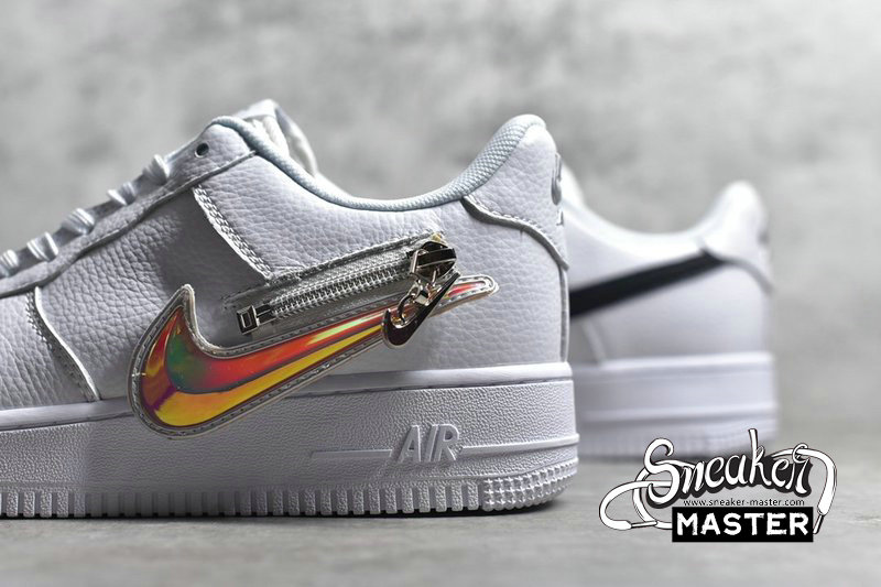 - The Nike Air Force 1 Low “Zip Swoosh” is just that, a pair that has removable zipper Swooshes. Three options are provided alongside the white tumbled leather sneaker, including two flat leather options in white and red, and one 3D Chrome hardware piece. The latter is complemented by more metallic piece on the heel branding and lace “AIR” dubraes, while tongue embroidery also dabbles in the metallic. Aside from that, the pair remains pretty relaxed, with the aforementioned leather covering the entire upper from toe to tongue to heel, and the pair sits atop a classic white sole unit.