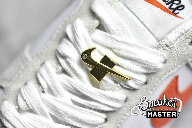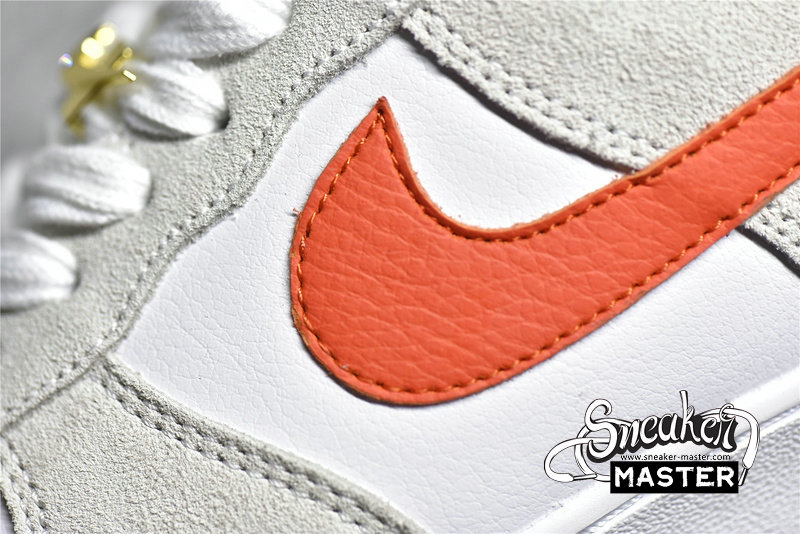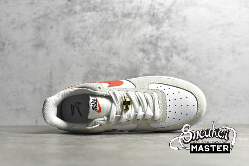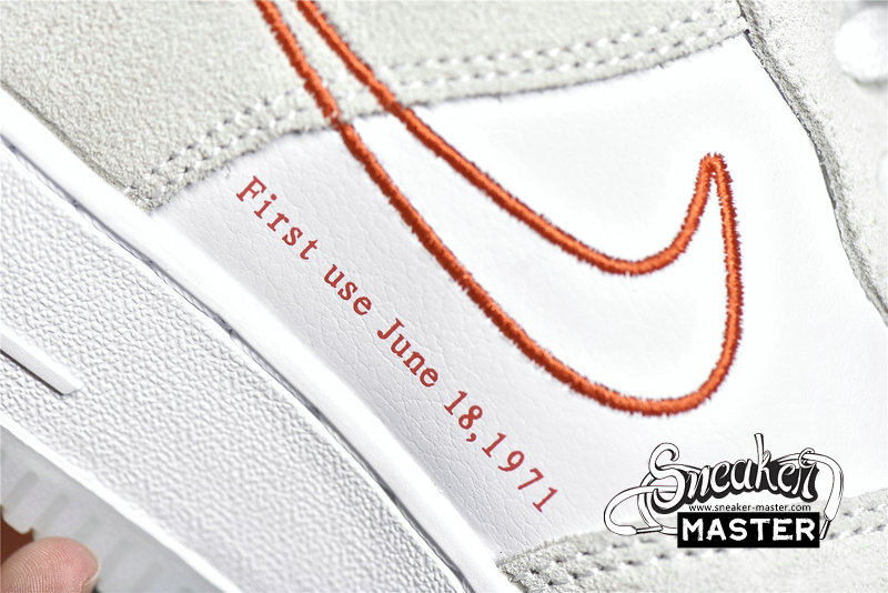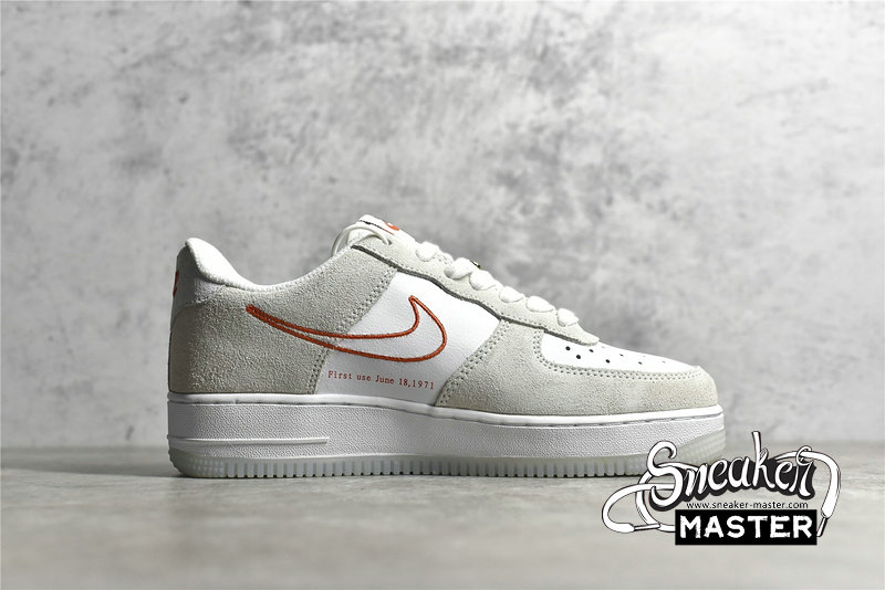 - This Nike Air Force 1 Low features a White leather base with suede overlays detailed with a solid Orange Swoosh on the lateral and outline Swoosh on the medial. June 18, 1971 is printed on the medial below the Swoosh as well as the year on the insoles as a nod to the exact date the Swoosh was created. Double lacing, Metallic Gold diamond-set Swoosh lace lock atop a White midsole and translucent outsole completes the design.