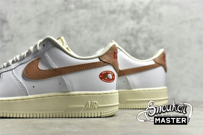 - This offering of the Nike Air Force 1 features a White leather base with Brown cracked leather Swooshes and heels nodding to the outer of a coconut. Other details includes produce stickers on the ankles and insoles, nutrition fact tongue tags and retro fruit-styled heel branding. The shoes also come with a special fruit bag.