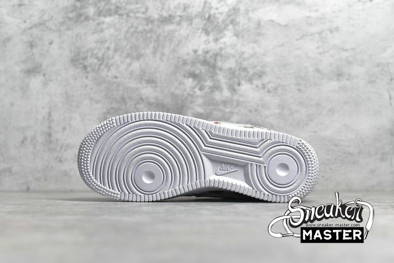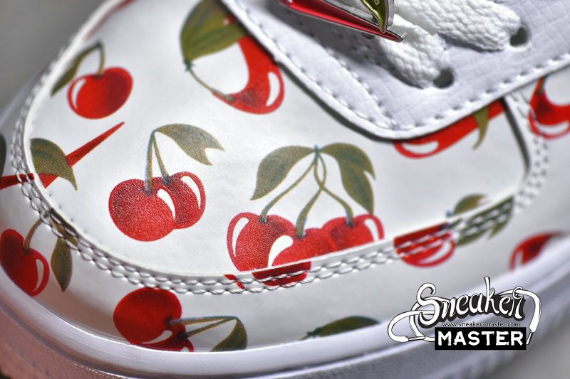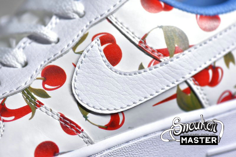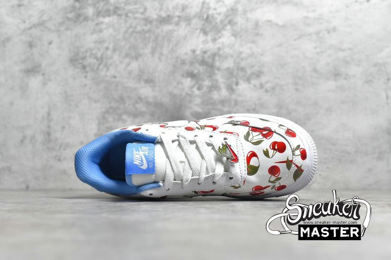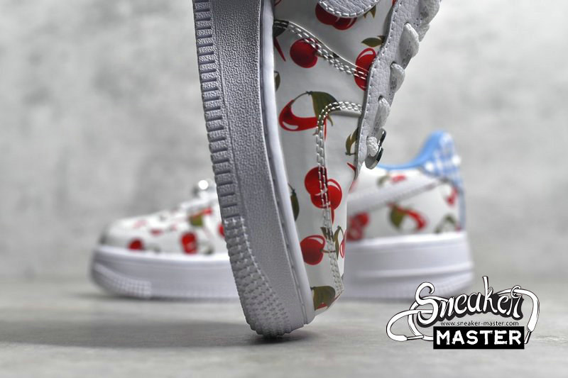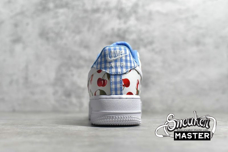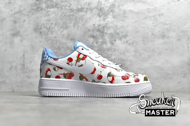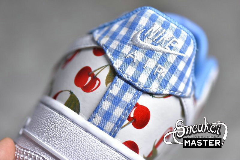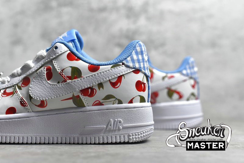 - This low-top Nike Air Force 1 comes dressed in a White, University Blue and Track Red color combination. Using White leather across the base while multiple cherries runs across the upper. In addition we have Blue plaid on the heel while Blue lands on the liner, White on the midsole and a matching rubber outsole. Completing the look is a cherry Swoosh lace dubrae.