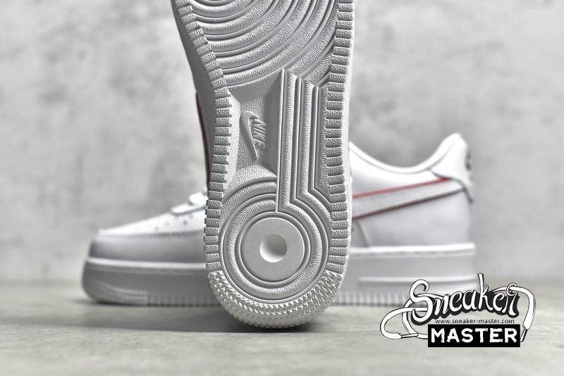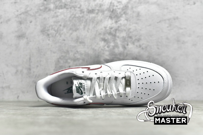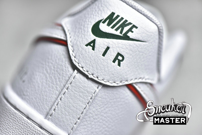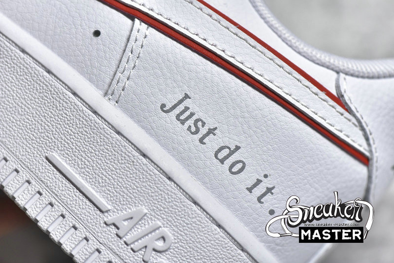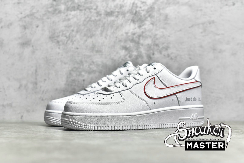 - This offering of the Nike Air Force 1 Low features an all-White leather build with Red trim around the side Swoosh logos. Deep Green branding on the tongues, heels, and insoles with “Just Do It” stamped on the lateral atop a solid White AF1 rubber sole completes the design.