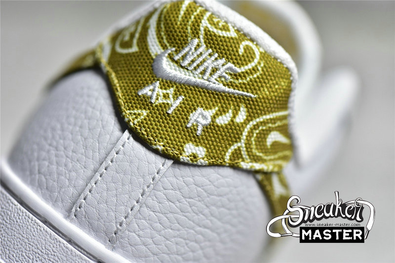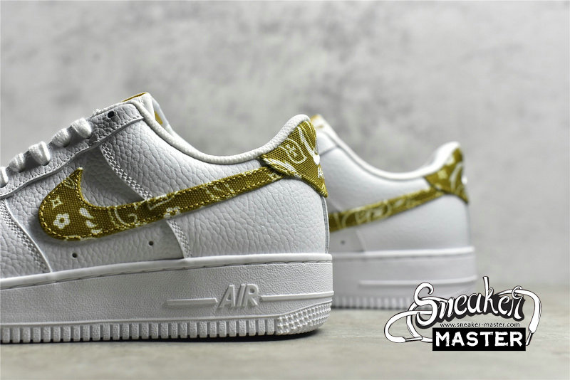 - This offering of the Nike Air Force 1 Low features a clean White tumbled leather upper that matches the tongues, laces, embroidered branded heels and AF1 rubber sole. Highlighting the shoe are Olive paisley prints on the Swooshes and heels along with additional branding on the tongues and insoles.