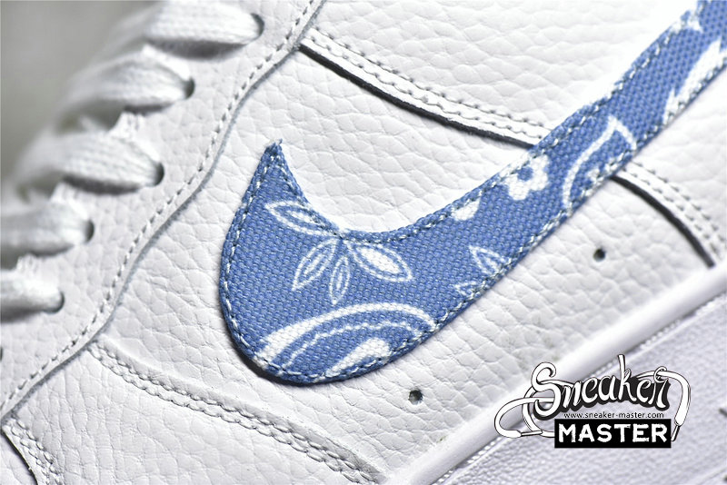 - This offering of the Nike Air Force 1 Low features a clean White tumbled leather upper that matches its tongues, laces, embroidered branded heels and AF1 rubber sole. Highlighting the shoe are Worn Blue paisley prints on the Swooshes and heels along with additional branding on the tongues and insoles.