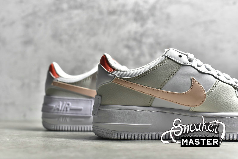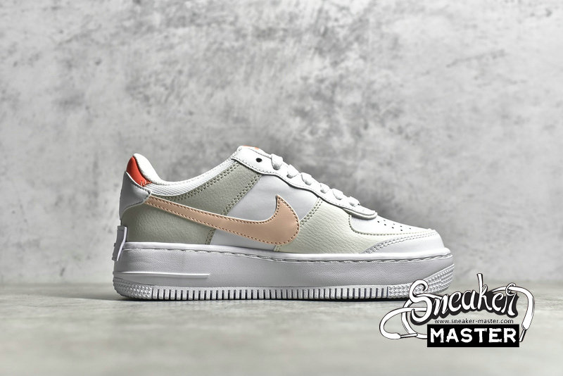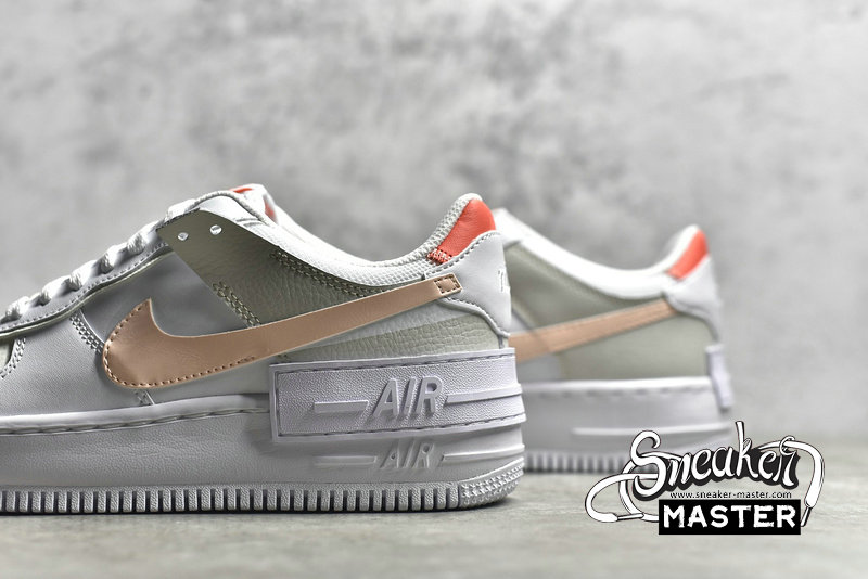 - This Nike Air Force 1 Shadow features a White leather base with Light Bone hues on the layered eyelets, toe box, and upper panels. Crimson covers the double-layered Swooshes that overlap a White check while Mango makes use on the tongue labels, painted heels, and double branded insoles. A solid White rubber sole completes the design.