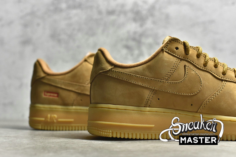 - The Supreme x Nike Air Force 1 Low SP 'Wheat' is made exclusively for the influential New York skate brand. It showcases a familiar build that recalls Timberland's iconic work boots and has a monochrome beige hue executed on a smooth nubuck upper, lined in soft DURAPLUSH that's accented with Supreme's red box logo on the lateral heel. Dual branding elements adorn the sneaker's woven tongue tag, sockliner and metallic lace jewels. It's built on a gum rubber cupsole that packs Nike Air heel cushioning in the heel, encapsulated within a foam wedge.