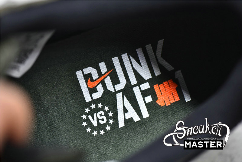 - The Undefeated x Air Force 1 Low SP released as part of the Dunk vs. AF-1 pack. Inspired by a very limited Dunk HIgh collaboration from 2003—and reissued in 2013—the shoe emerges with a ballistic mesh construction on the upper, finished in olive green and overlaid by tonal leather. Black Swoosh branding contrasts the side wall, while the lateral heel and woven tongue tag include a Five Strikes logo. 'Dunk vs. AF-1' emerges on the insole, and underfoot, the off-white midsole houses Air in the heel for cushioning, giving way to a concentric rubber outsole for traction.