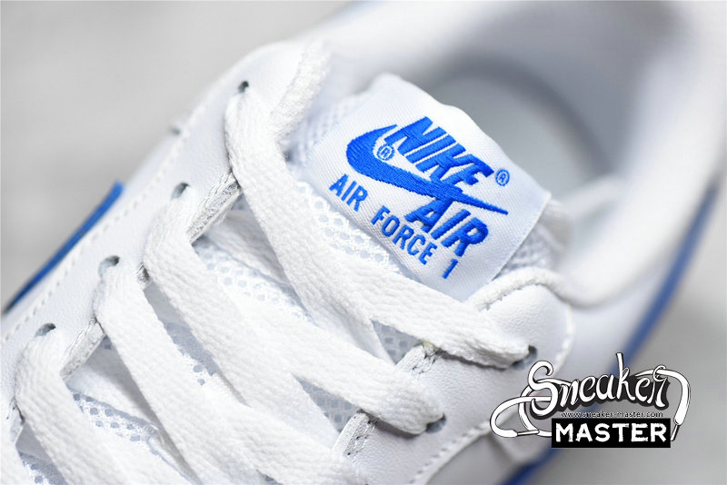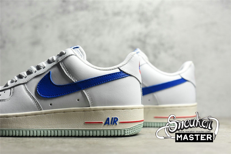 - This offering of the Nike Air Force 1 Low also arrives in a USA color blocking. It features a White leather upper with mesh tongues and lining paired with Blue Swooshes and branding. Red contrasting accents, a Nike basketball motif on the heels atop a Sail midsole and Grey rubber outsole completes the design.