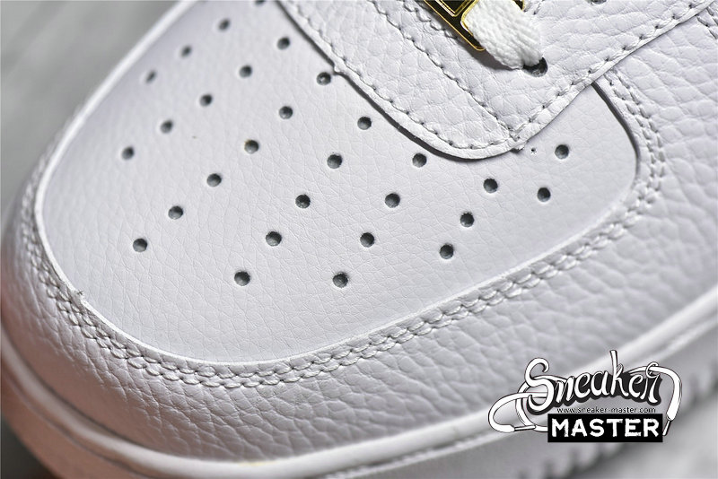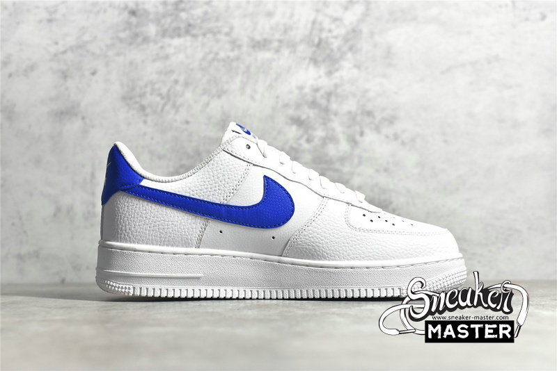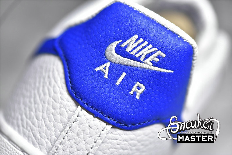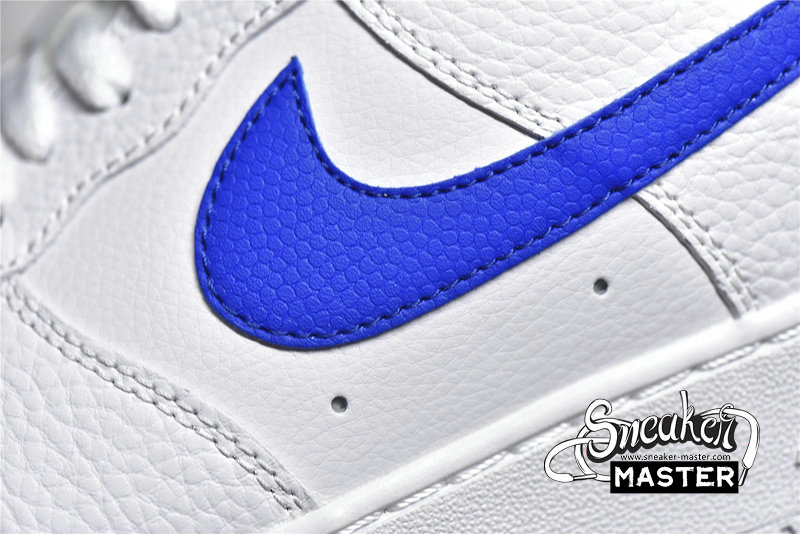 - This offering of the Nike Air Force 1 features a White leather upper with matching tumbled leather overlays. Highlighting the shoe are Royal Blue basketball textured Swooshes and heels as Blue also appears on the tongue and insole branding. An all-White AF1 rubber sole completes the design.