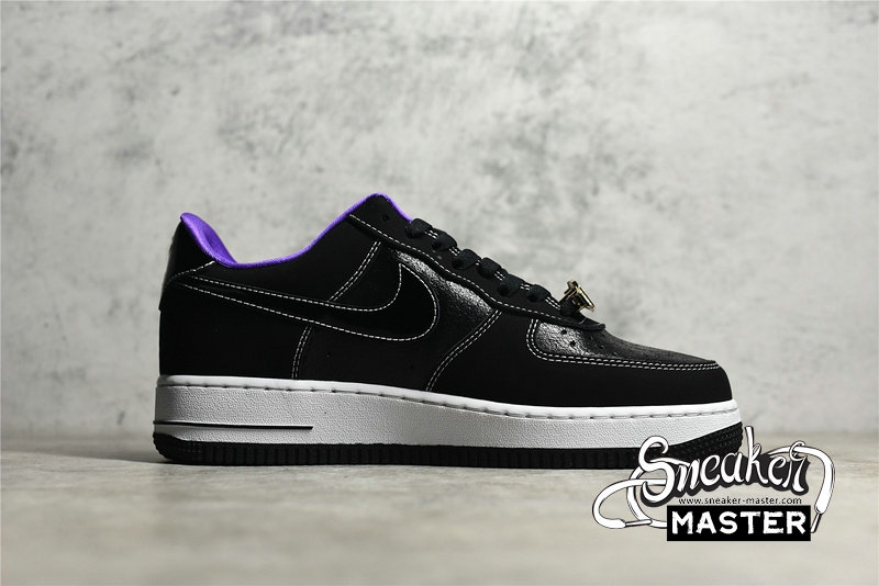 - This offering of the Nike Air Force 1 Low features an all-Black base constructed in a mix of leather, nubuck, and patent leather materials. White contrasting stitching with Metallic Gold tongue and heel branding highlighted with Purple lining to give off that LA vibe. A White midsole atop a Black rubber outsole completes the design.