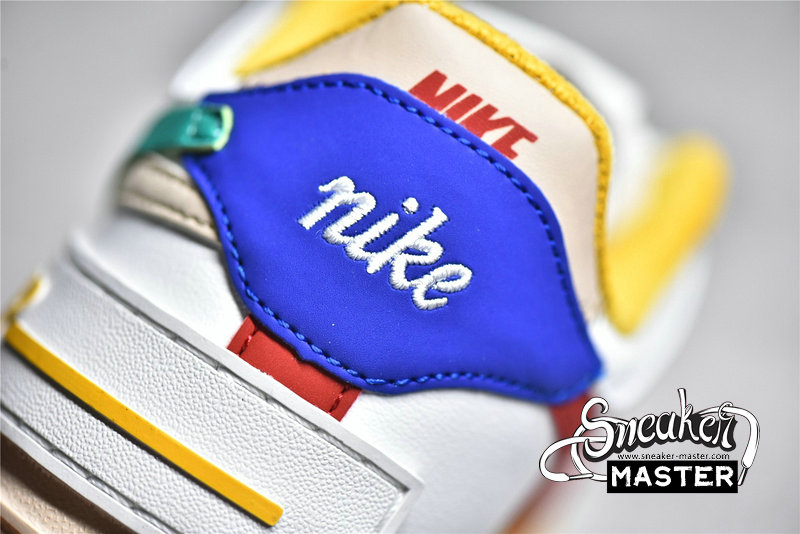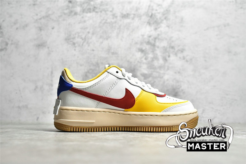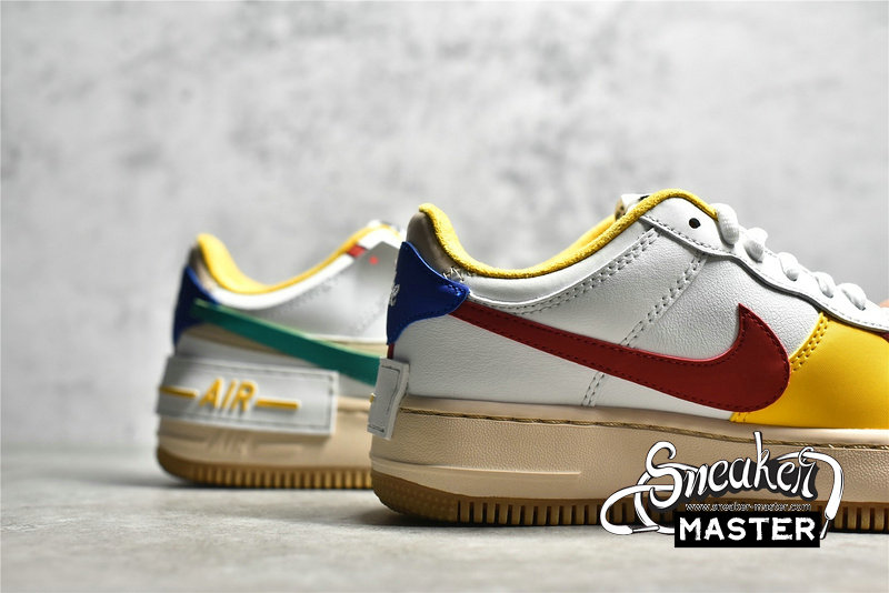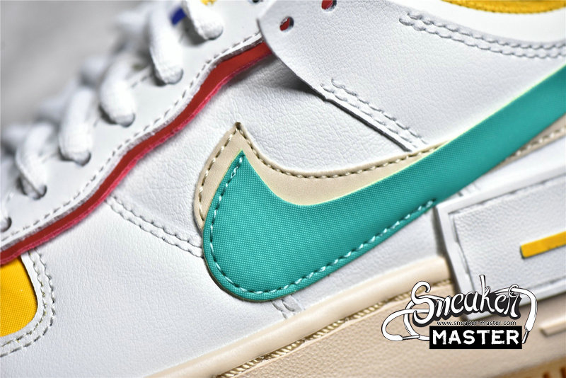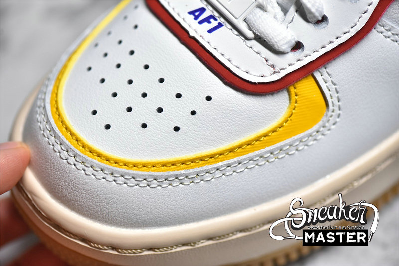 - This offering of the Nike Air Force 1 Shadow comes constructed in a mix of leather and mesh materials featuring a White base detailed with Multi-Color contrasting accents. A Sail midsole with Gum trimming along the outsole completes the design.