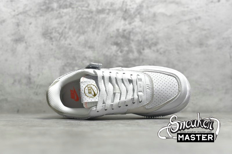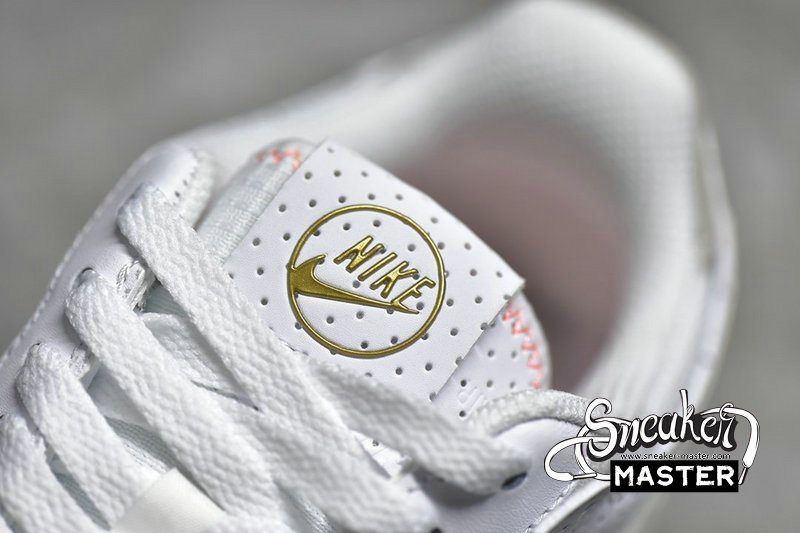 - This Nike Air Force 1 comes with added perforated detailing on the toe and heels highlighted with Pink accents on the heels and insoles. Gold branding on the tongue atop a solid White rubber sole completes the design.