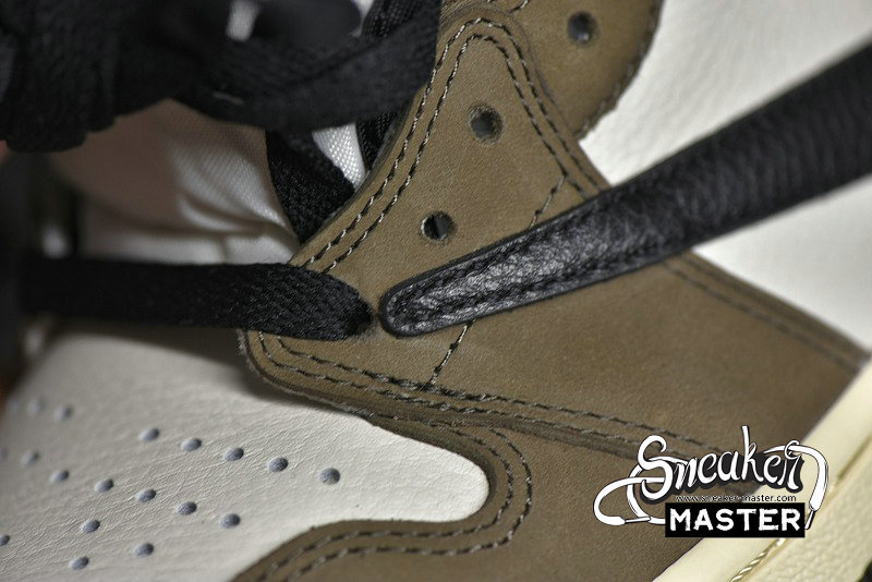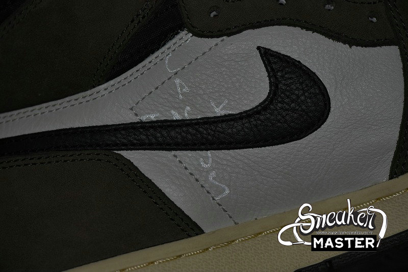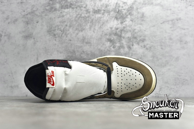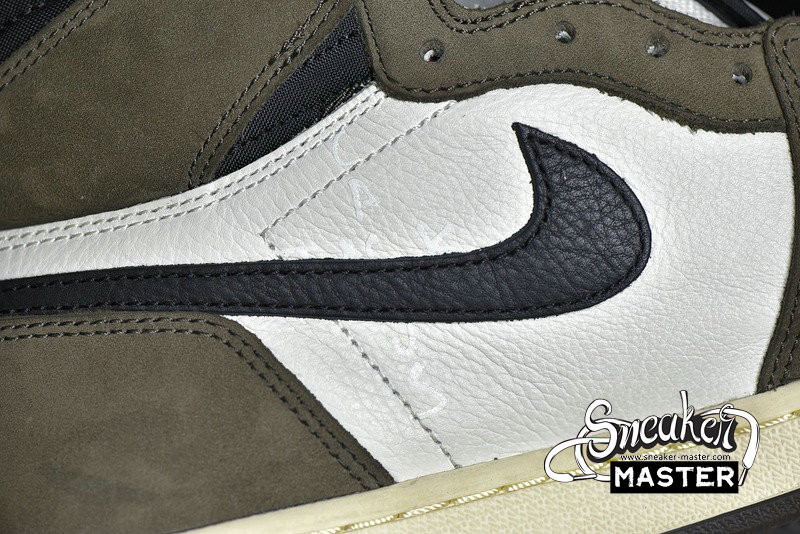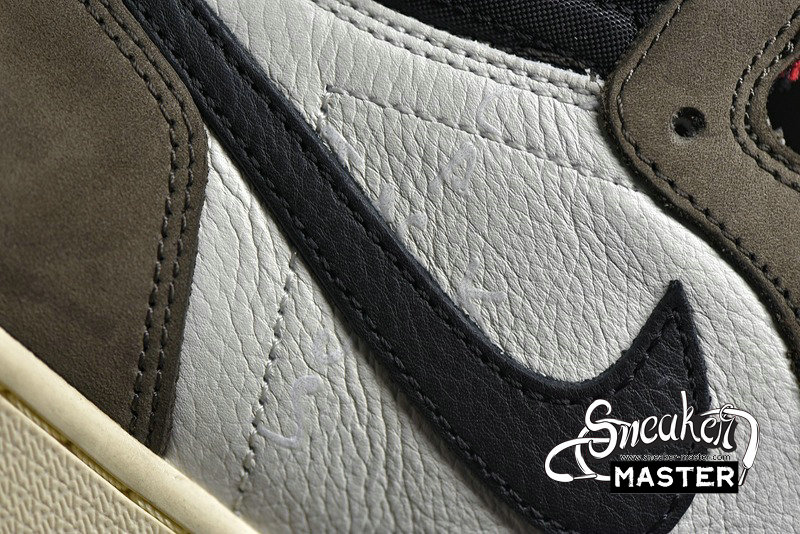- A collaboration between Travis Scott and Jordan brand, the Travis Scott x Air Jordan 1 Retro High OG 'Mocha' features an oversized backward Swoosh on the lateral side. The tumbled white leather and Dark Mocha suede construction is accented by University Red Cactus Jack and Nike branding on the tongue, while the heel sports Scott's face logo in a debossed fashion.
