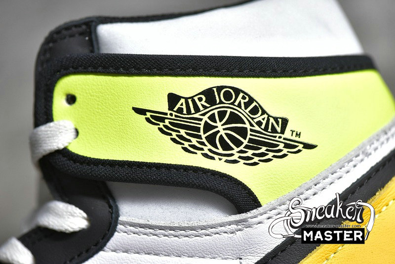 - Inspired by various Air Jordan 1 colorways, the Air Jordan 1 Retro High OG 'Volt Gold' features vibrant accents. The shoe's leather upper appears primarily in white, with University Gold on the heel and Volt on the collar overlay. Black throughout provides contrast, while the exposed-foam tongue includes a reversed translucent tag. An off-white Air midsole offers cushioning, with a black concentric rubber outsole providing traction.