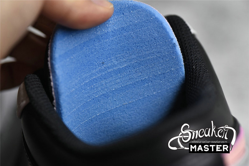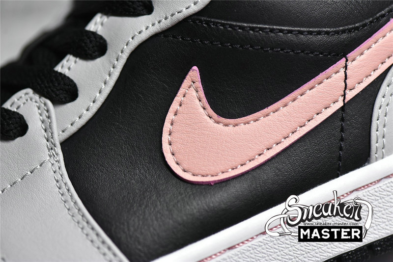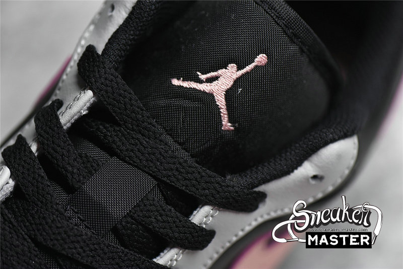 - This offering of the low-top Air Jordan 1 features a White toe box with Black on the side panels, tongues, laces, liner, Wings logo and rubber outsole. Highlighting the shoe are Pink contrasting accents on the branded areas, Swooshes, and stitching along the White midsole to complete the design.