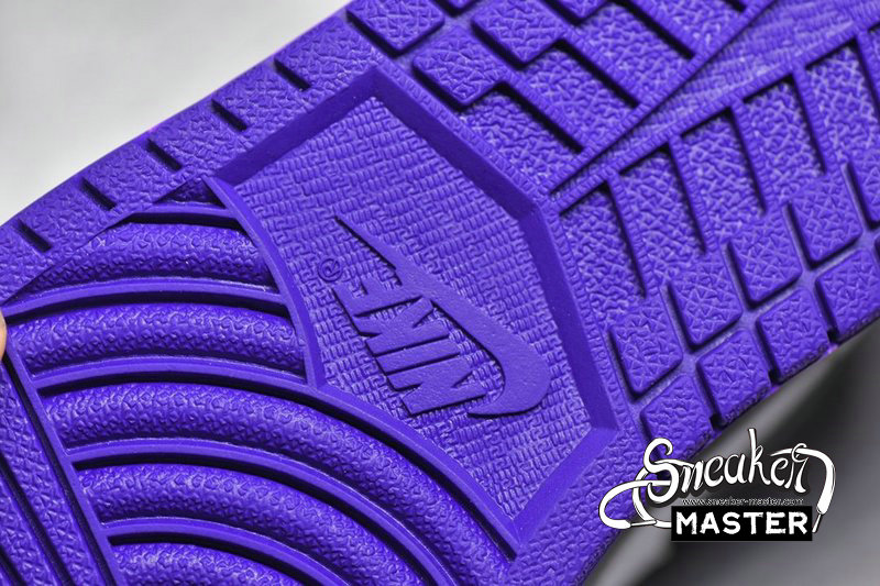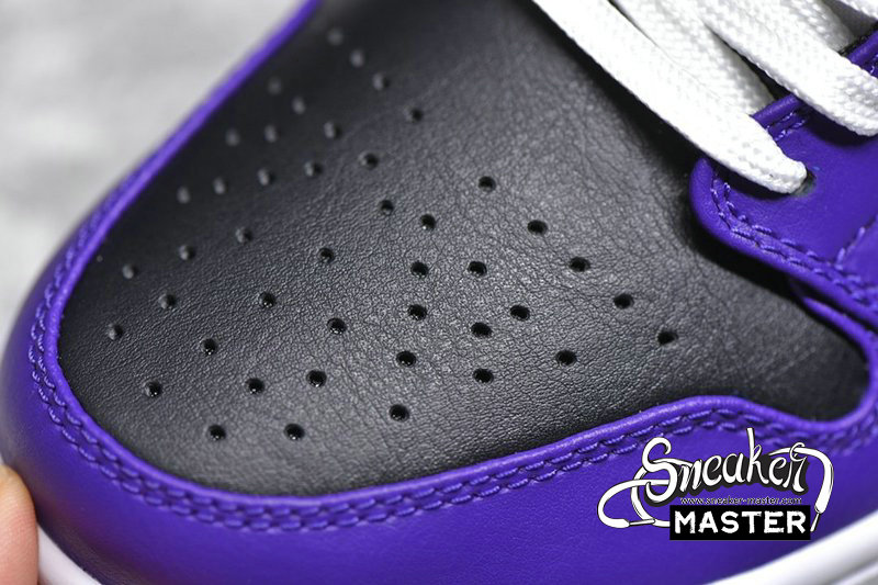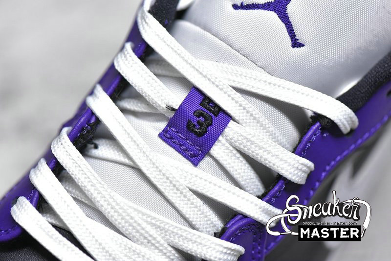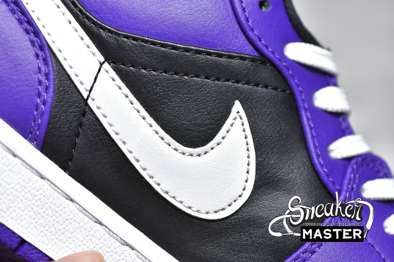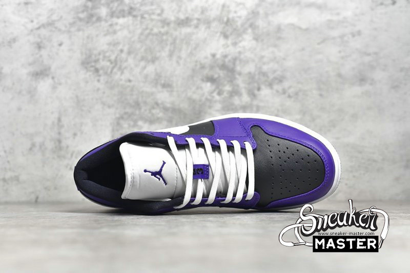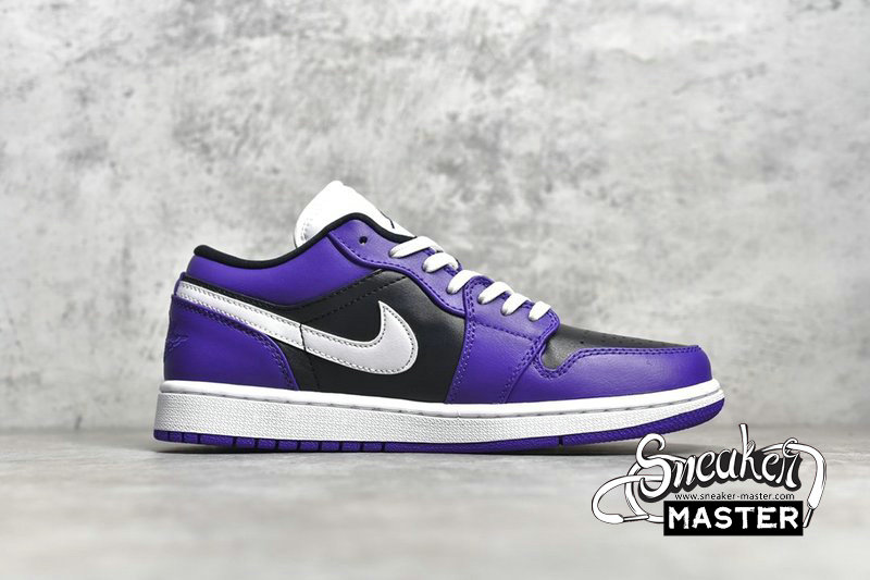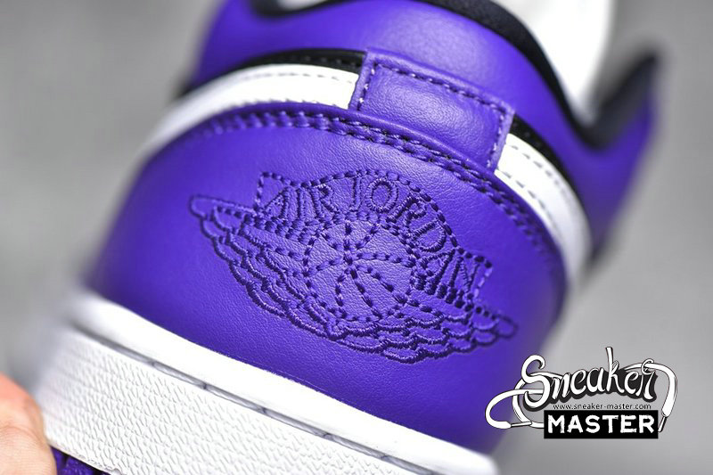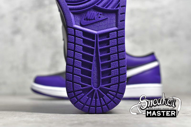 - Looking closer this low top edition of the Air Jordan 1 comes with Black micro-perforated leather across the toe and side panels while Purple leather takes over the overlays. White then lands on the tongues, Swoosh logos, laces and midsole while a Purple rubber outsole finishes the look.