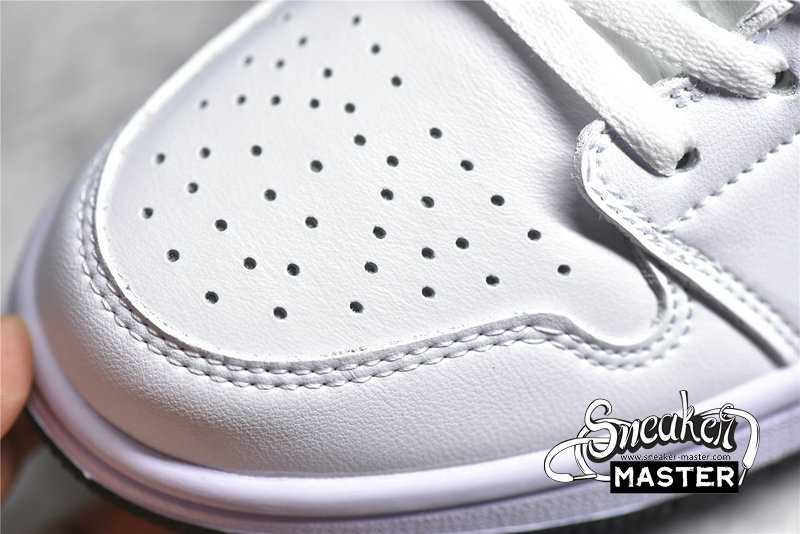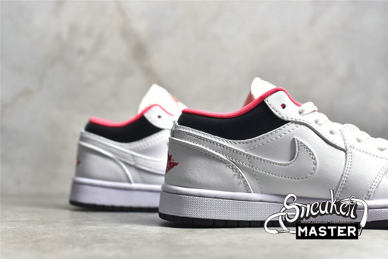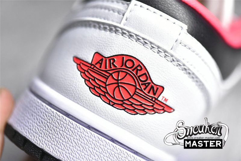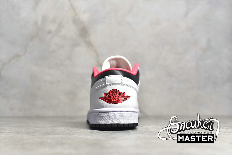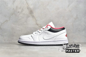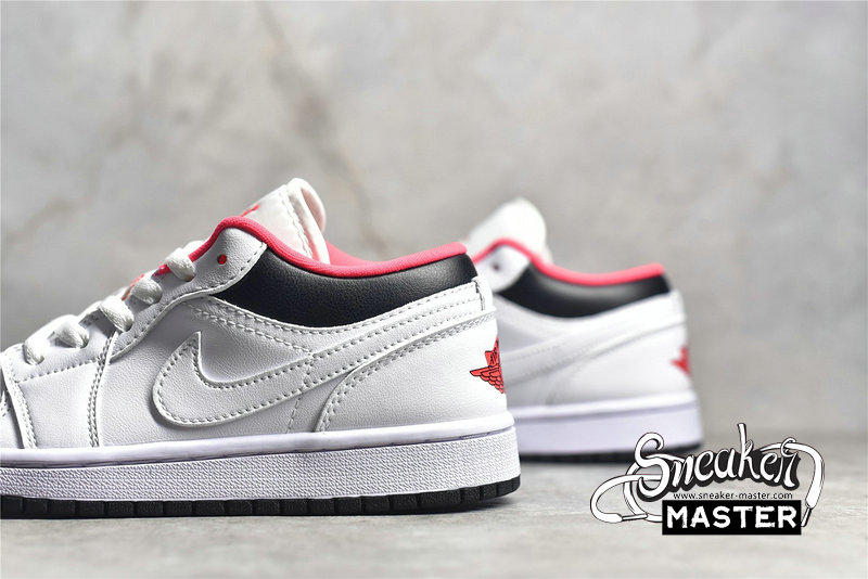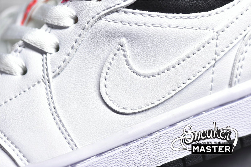 - This offering of the low-top Air Jordan 1 features a White leather base paired with Black collars and rubber outsole. White continues on the laces, Swooshes, and midsole highlighted with Red contrasting accepts on the tongues, liner, insole and Wings logo in the rear.