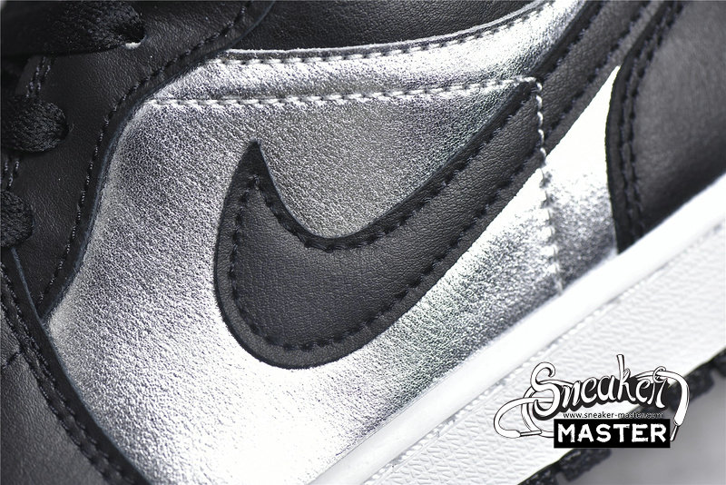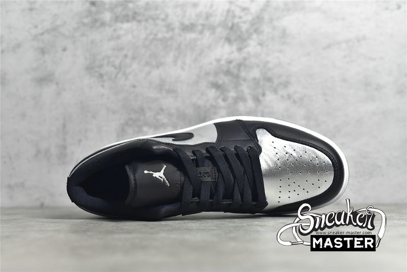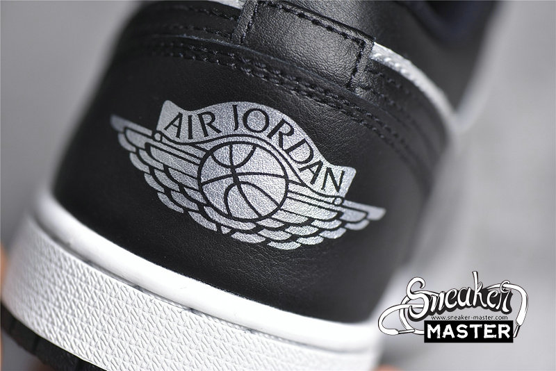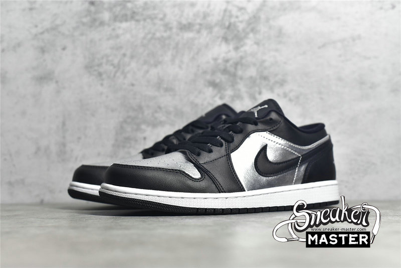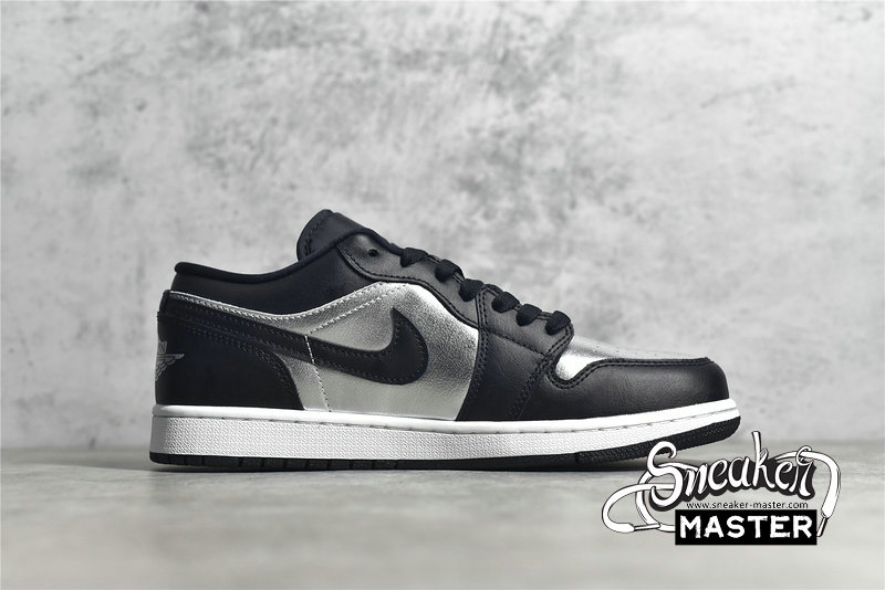 - This offering of the Air Jordan 1 Low features a Silver crinkled leather on the toe box and side panel paired with Black smooth leather overlays. Black mesh tongues, matching colored laces, Silver embroidered Jumpman tongues, insoles, and Wings heel logos atop a White midsole and Black rubber outsole completes the design.