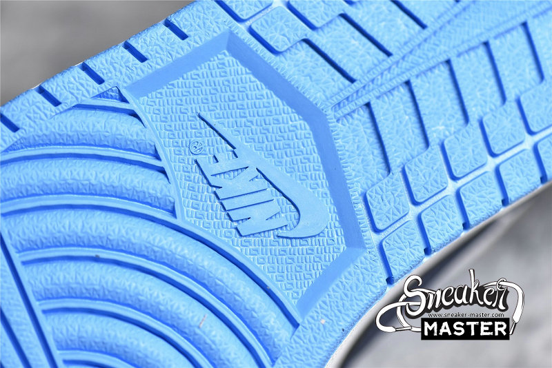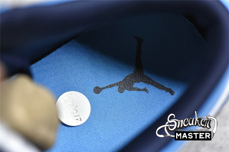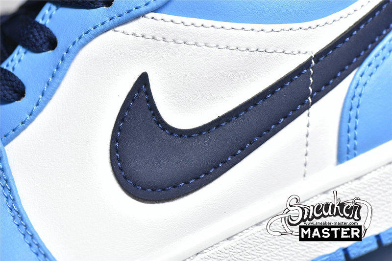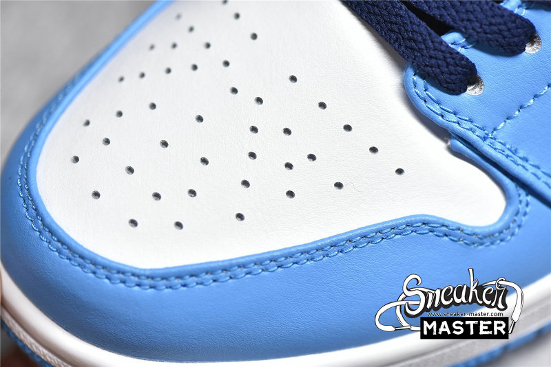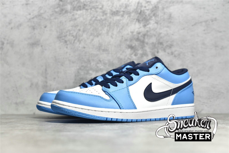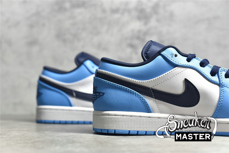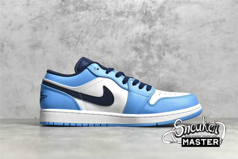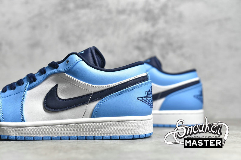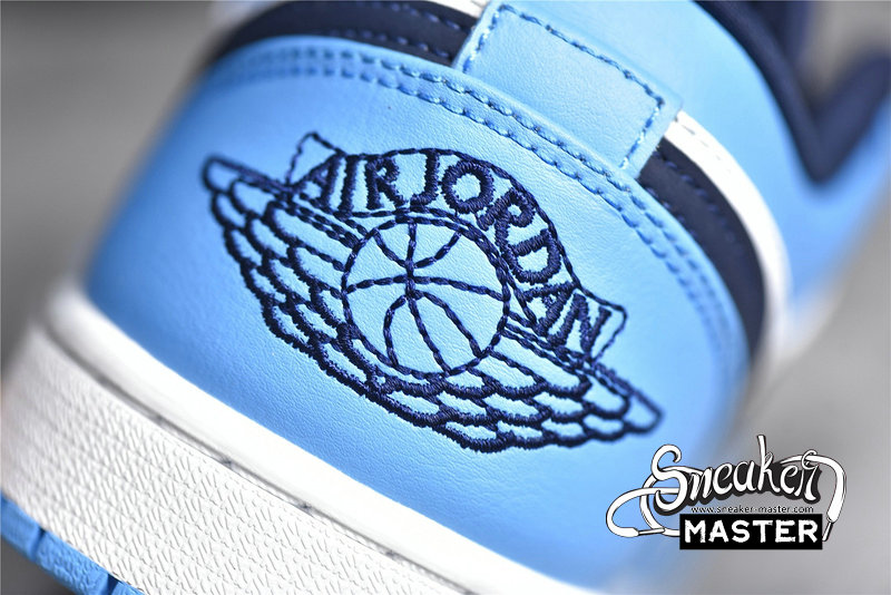 - This offering of the “UNC” low-top Air Jordan 1 features a White leather base with University Blue overlays, Jumpman logos, and rubber outsole. Navy detailing on the Swooshes, laces, tongues, lining, and Wings logo atop a White midsole completes the design.