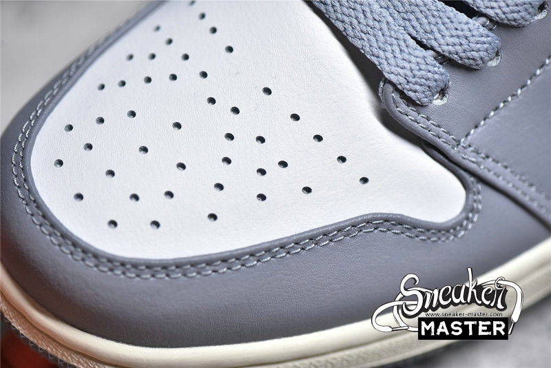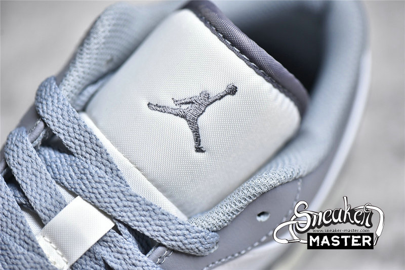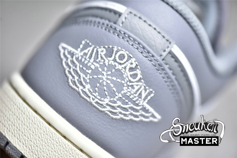 - This offering of the Air Jordan 1 Low features a White leather base with Grey overlays, Swooshes, laces, tongue Jumpman and rubber outsole. White Wings in the rear atop an aged midsole completes the vintage vibe.