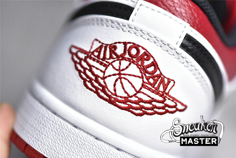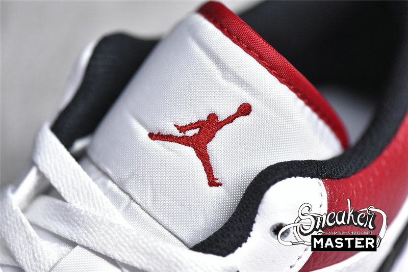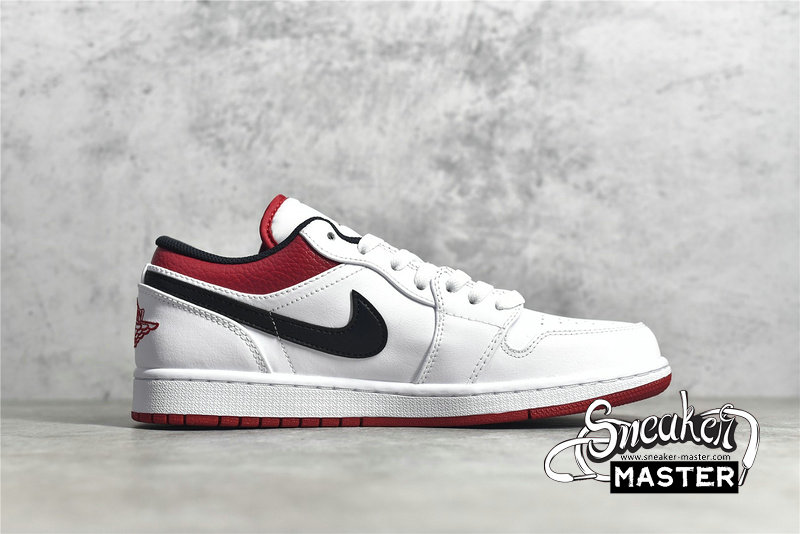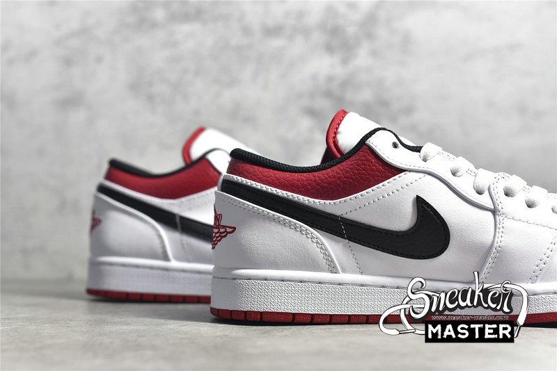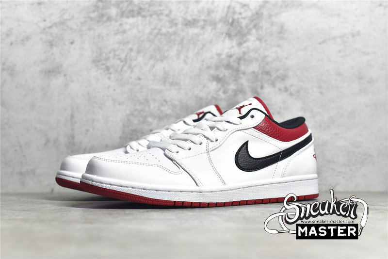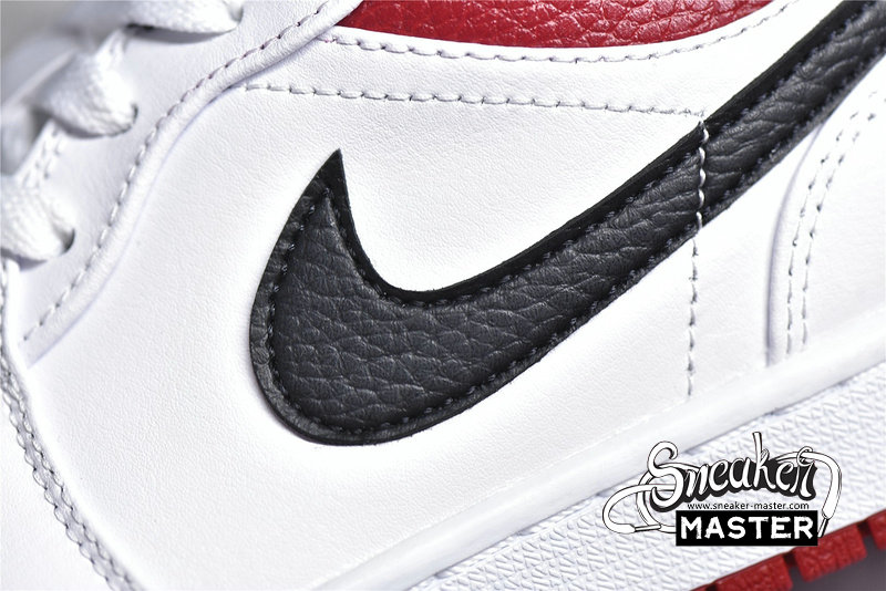 - This offering of the low-top Air Jordan 1 features a White tumbled and smooth leather upper paired with Red contrasting accents throughout. A Black Swoosh on the sides atop a Red rubber outsole completes the design.