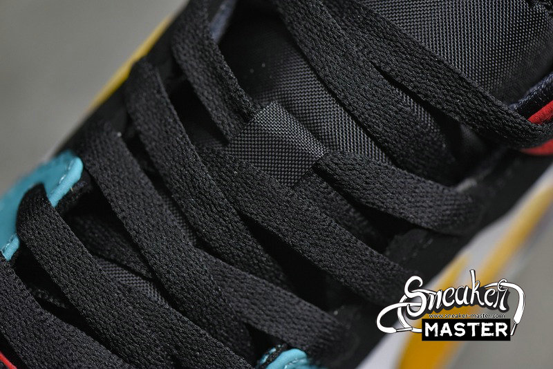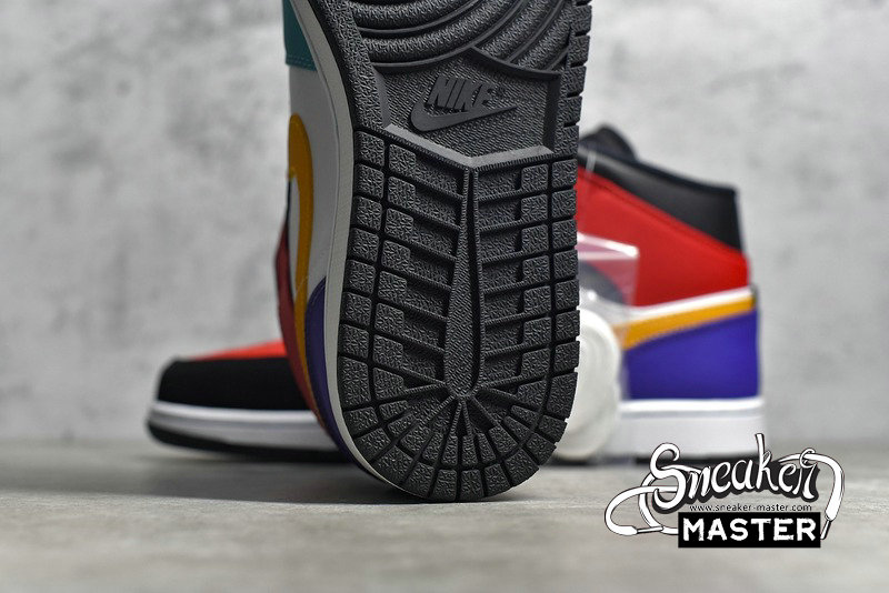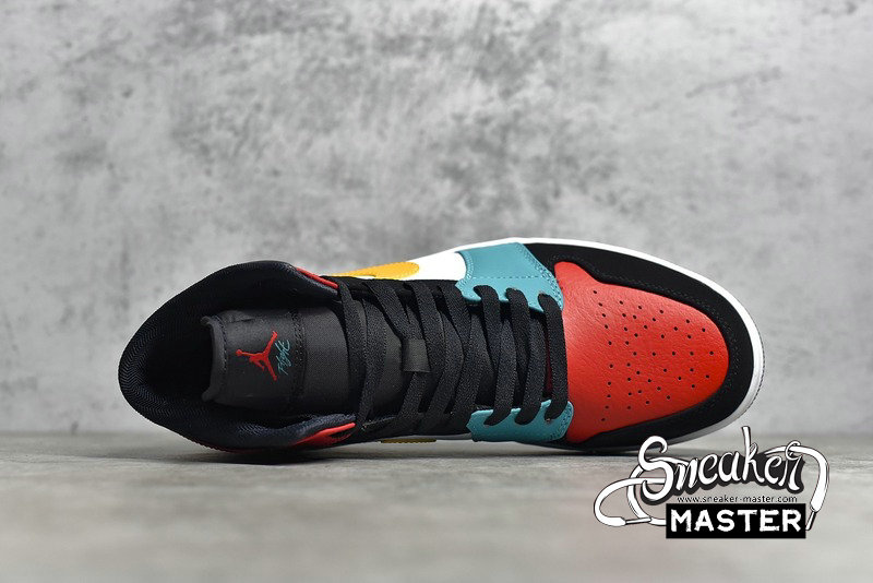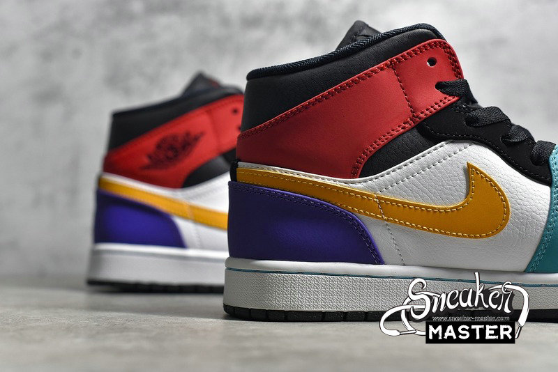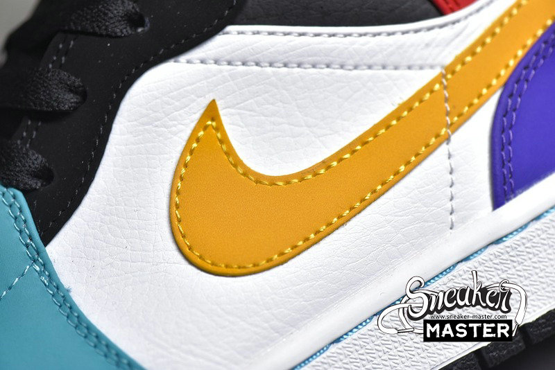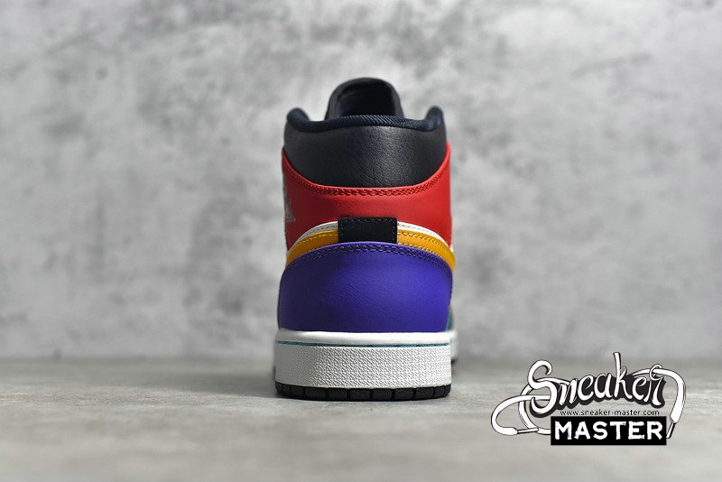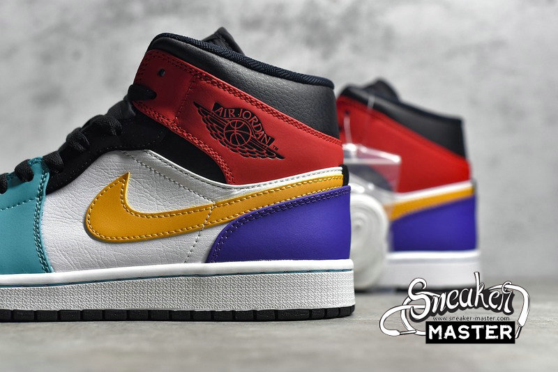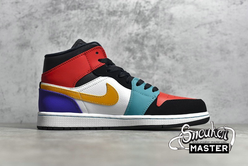 - Featuring a design that takes a cue from Nike’s ‘What The’ concept, the Air Jordan 1 Mid ‘Multi-Color’ unites vivid colors to highlight a Chicago-inspired foundation. The latter appears on the toe and collar, dressed in black and red. A white leather quarter panel, layered with an orange leather Swoosh, is lined by clashing bursts of Turbo Green and purple.