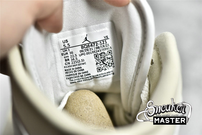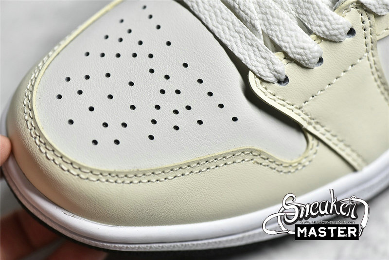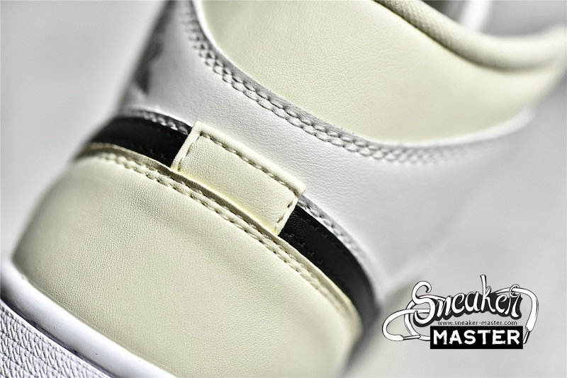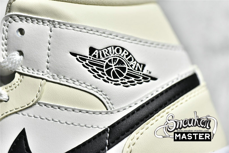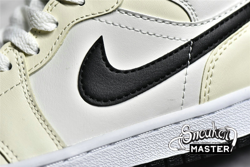 - Modeled after the 1985 original with added neutral tones is the women's Air Jordan 1 Mid 'Coconut Milk.' The leather upper features a clean white base with cream-colored overlays and a black signature Swoosh. A woven Jumpman tongue tag sits atop, and a retro Wings logo is stamped on the lateral ankle. It's built on a traditional rubber cupsole with encapsulated Air-sole cushioning under the heel.