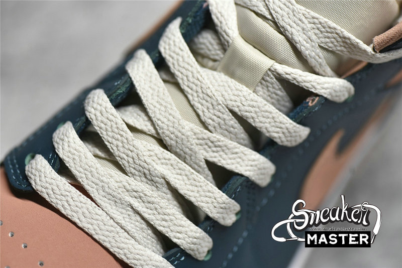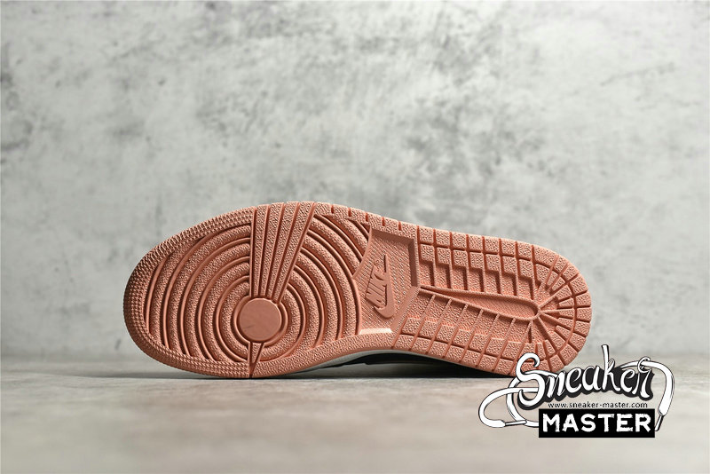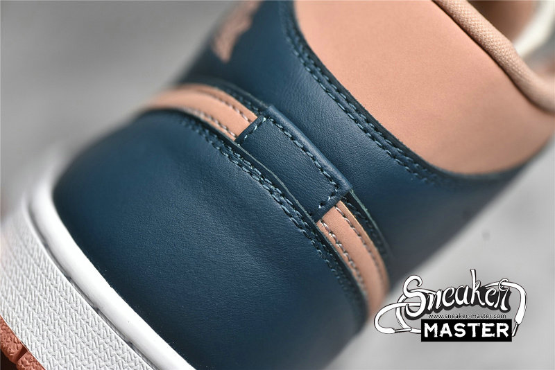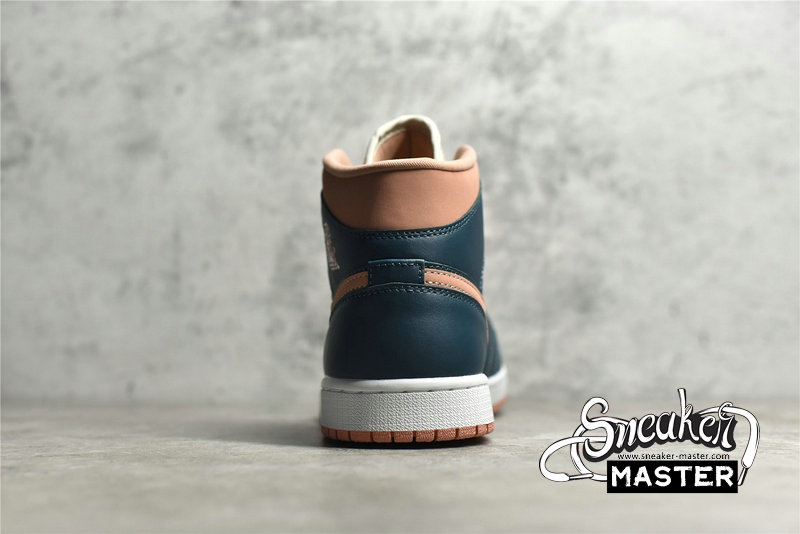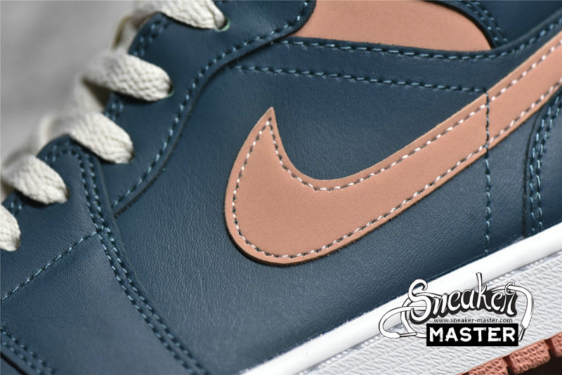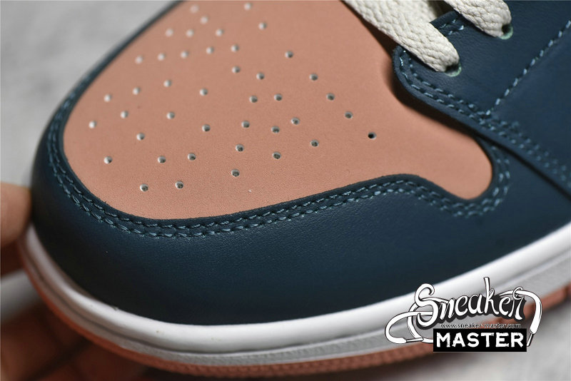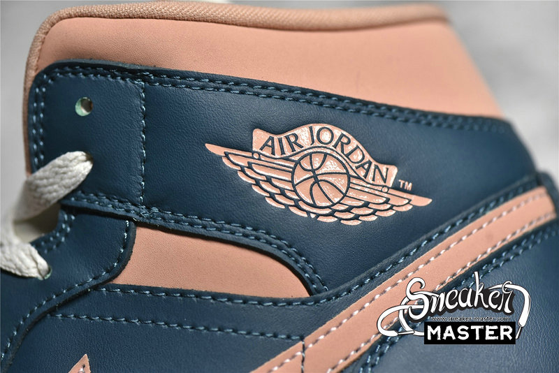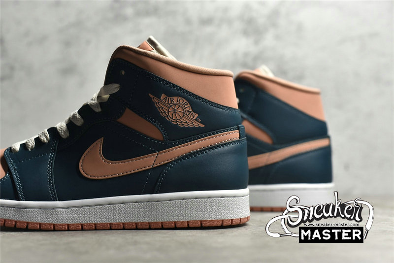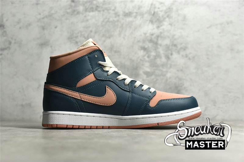 - This offering of the mid-top Air Jordan 1 comes constructed in a full leather build with nylon tongues and mesh lining. It features a Pink hue on the toe box, ankle collar, tongue labels, Swooshes and outsole paired with Dark Teal Green overlays. White laces and midsole completes the design.