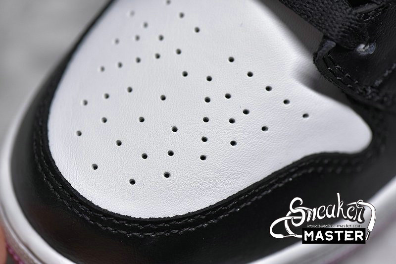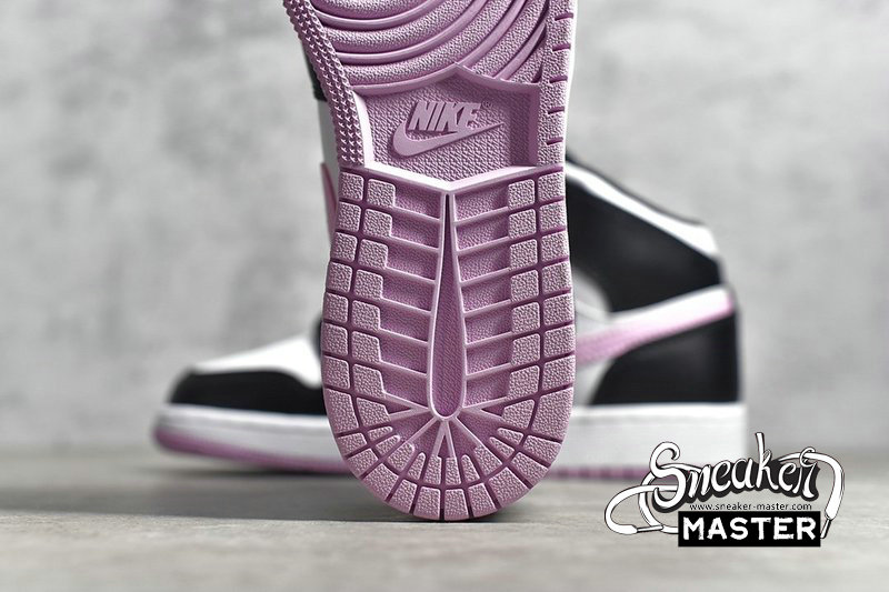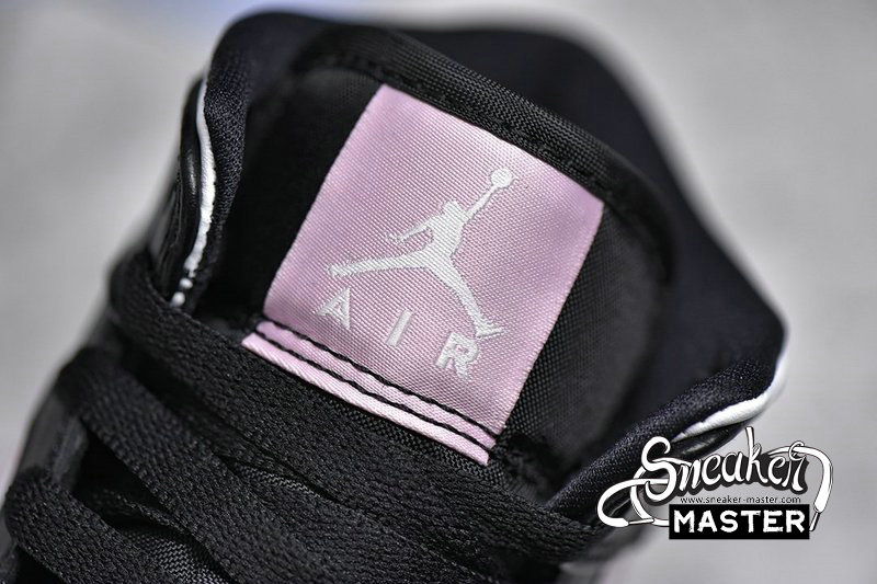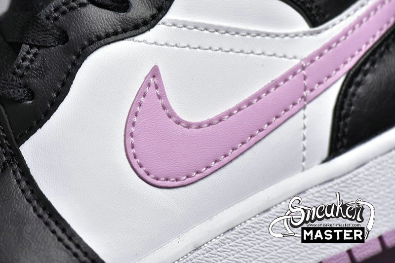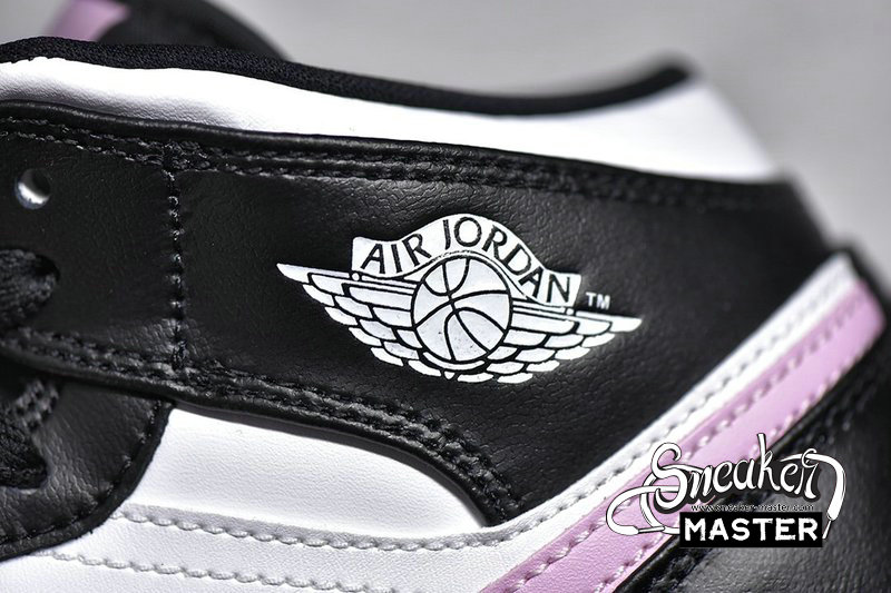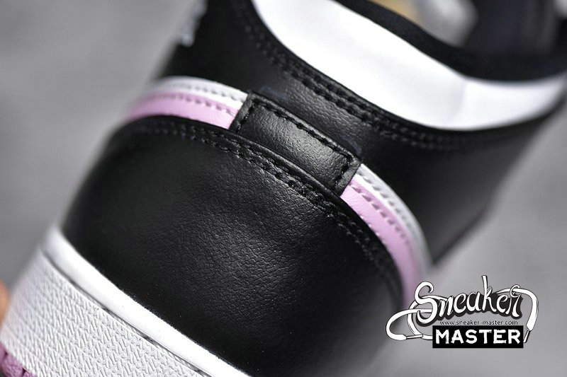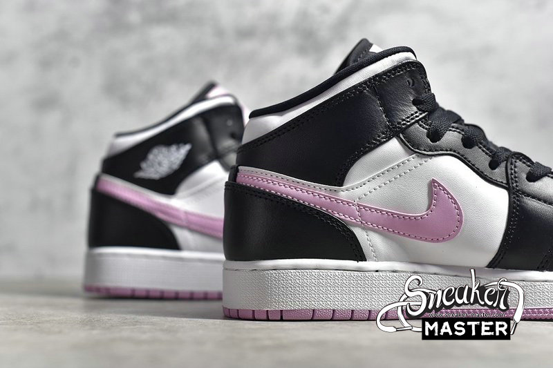 - This mid-top Air Jordan 1 comes with White leather on the upper while Black leather runs across the overlays. Furthermore, Pink adorns the Swoosh, tongue label, insole, and rubber outsole. Finally, a White midsole finishes the look.